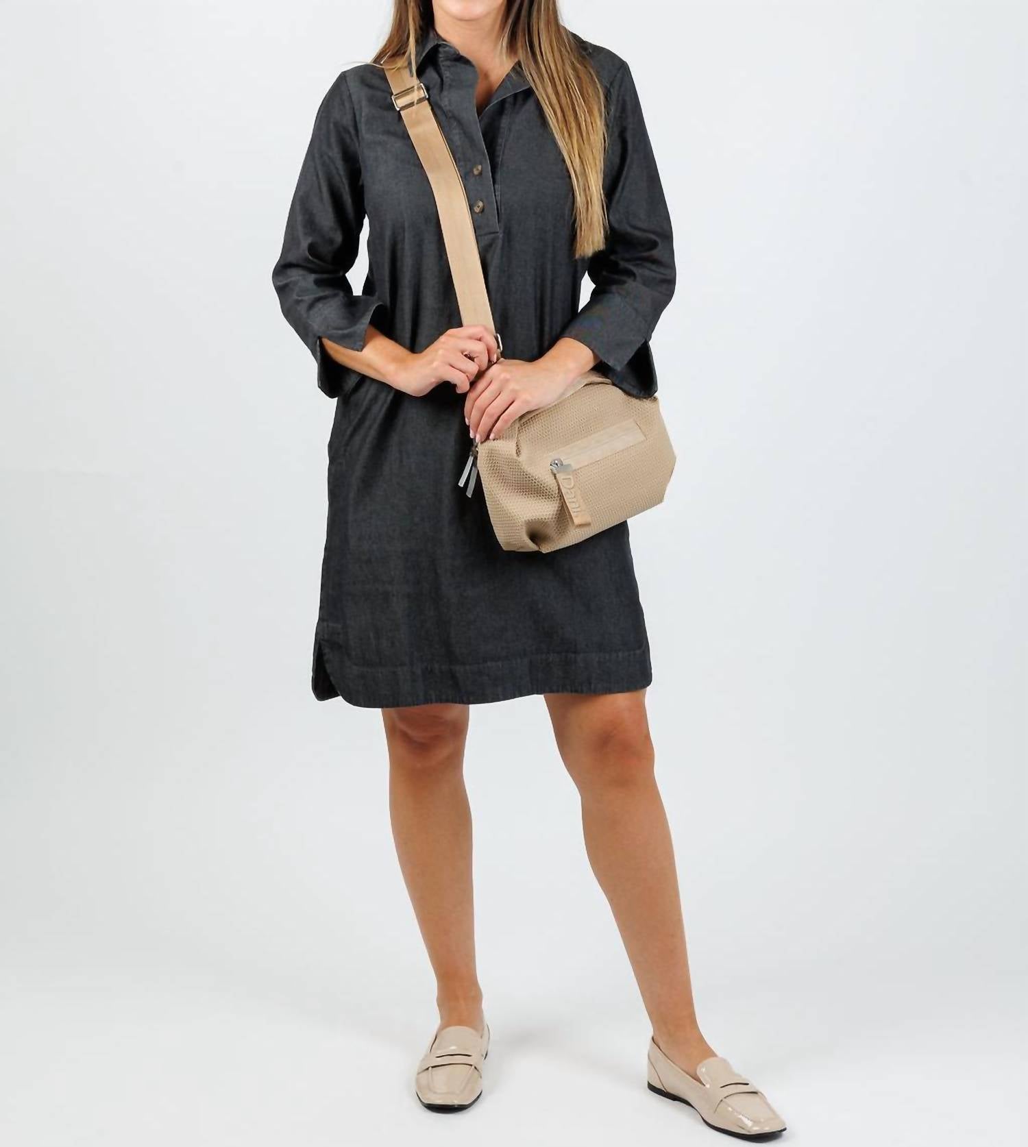 Introducing the Women's Aileen Three Quarter Sleeve Denim Dress by Hinson Wu, crafted for those seeking sophisticated casual style. This shift silhouette dress boasts three-quarter sleeves made from a soft cotton blend in a black wash denim with a slightly above knee length. The design is enhanced by a tailored collar and decorative buttons at the back, while side hem slits provide ease of movement. Closure: Button closure. Composition: 60% Tencel, 40% Cotton. Perfect for vacation-ready looks with a monochrome trend appeal.