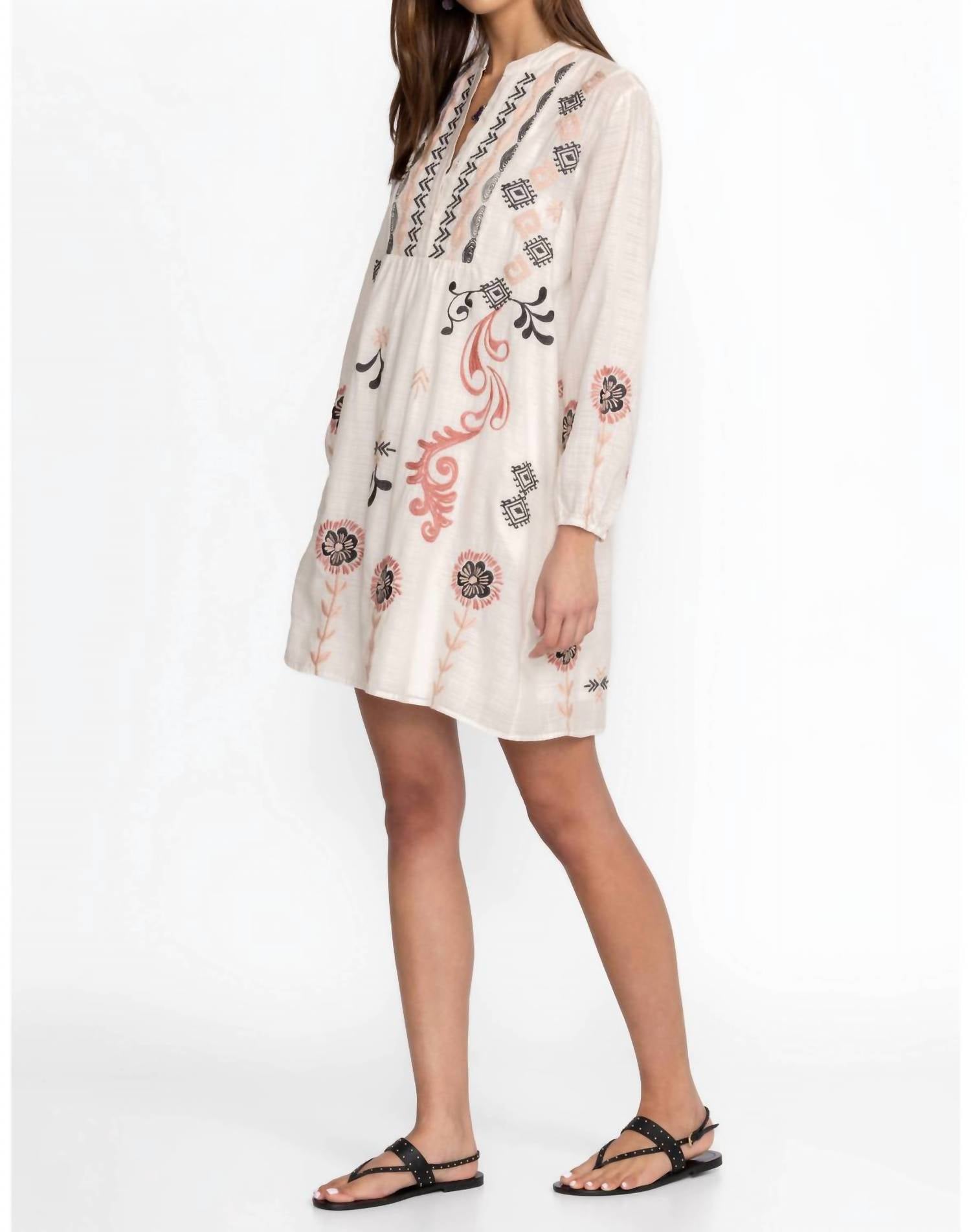 O minivestido perfeito para os meses mais quentes. Apresentamos o Vestido de Campo Bellania Button Yoke da Johnny Was, uma combinação perfeita de estilo e conforto com sua estampa floral Olinda Stripes. Este minivestido possui mangas três quartos e decote em V com fecho prático de botão. Confeccionado em uma mistura de 82% algodão e 13% viscose, oferece um caimento solto com a praticidade dos bolsos e mangas elásticas. Cuidar deste vestido deslumbrante é simples e recomenda-se lavar à máquina.