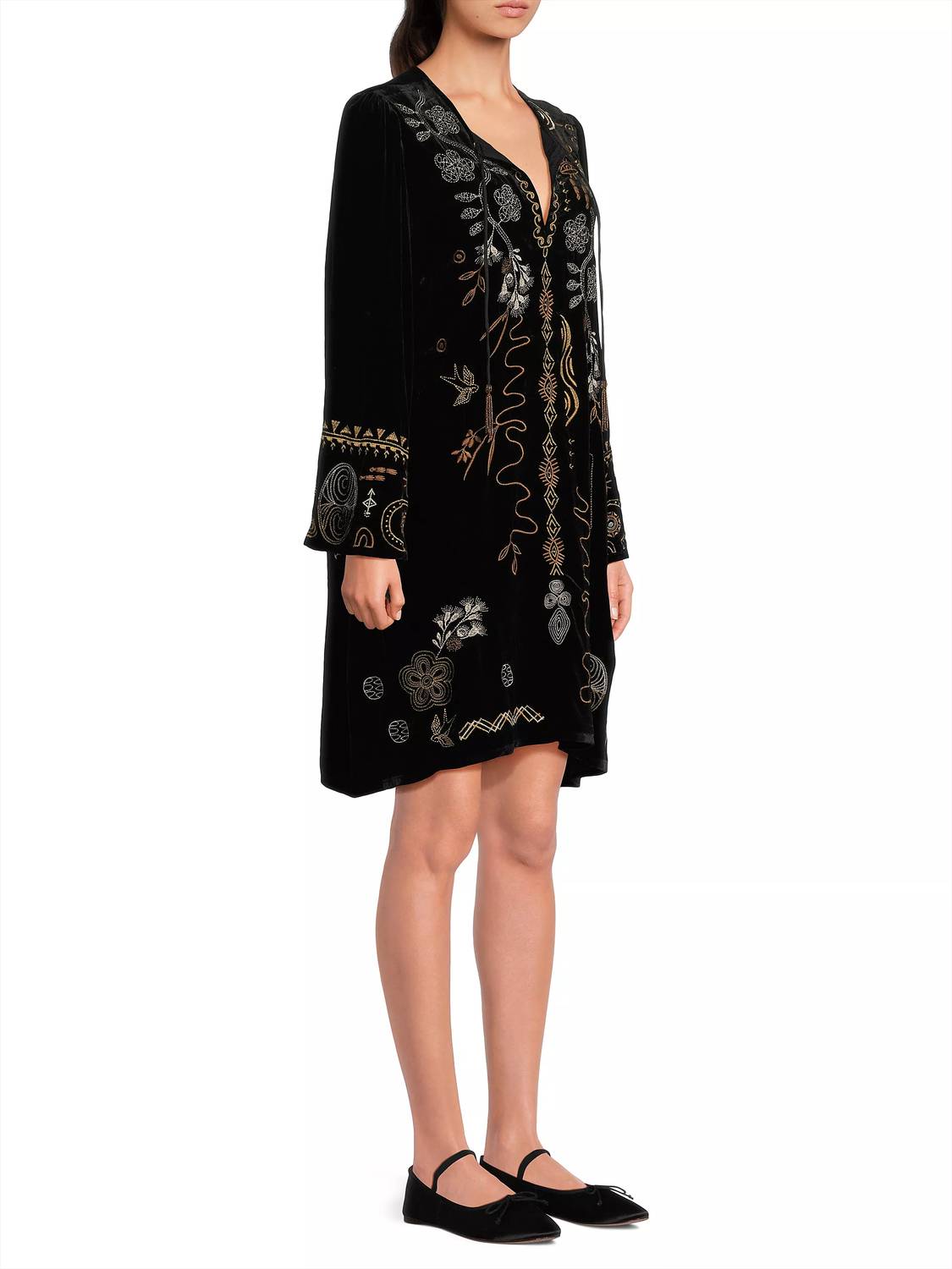 Um vestido curto e arejado para os dias mais quentes. Destaque seu guarda-roupa com o Vestido Relaxed Jenai Kimono Sleeve da Johnny Was, perfeito para qualquer ocasião com seu sofisticado tom preto. Com mangas longas e um elegante decote em V, este minivestido de caimento relaxado é confeccionado em uma luxuosa mistura de 82% rayon e 18% seda. O vestido veste com facilidade e mede aproximadamente 99 cm do ombro à bainha. Cuide dele com facilidade, pois é lavável à máquina.