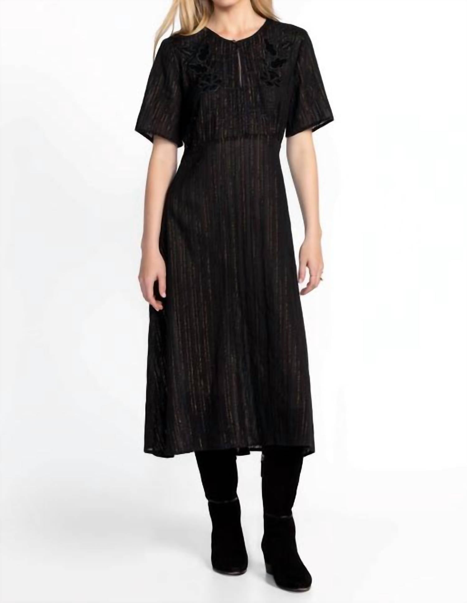 O Vestido Mirah Effortless é confeccionado em uma rica mistura de algodão com um sutil brilho metálico, conferindo-lhe um toque leve e arejado. Possui decote Henley e mangas curtas, além de ser totalmente forrado para maior conforto. O vestido apresenta delicados bordados, adicionando um toque feminino. Para um visual elegante, combine-o com saltos metálicos e joias delicadas.