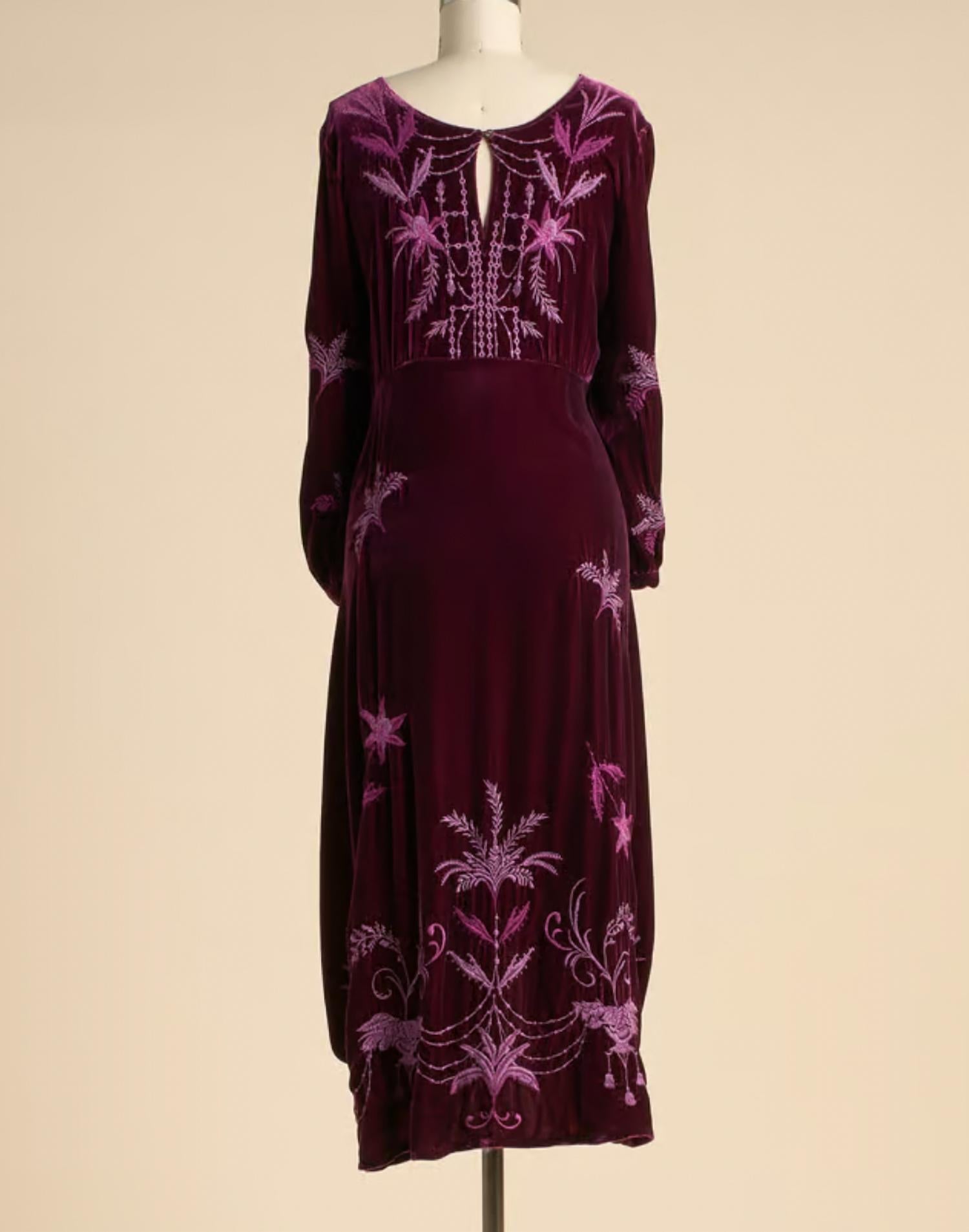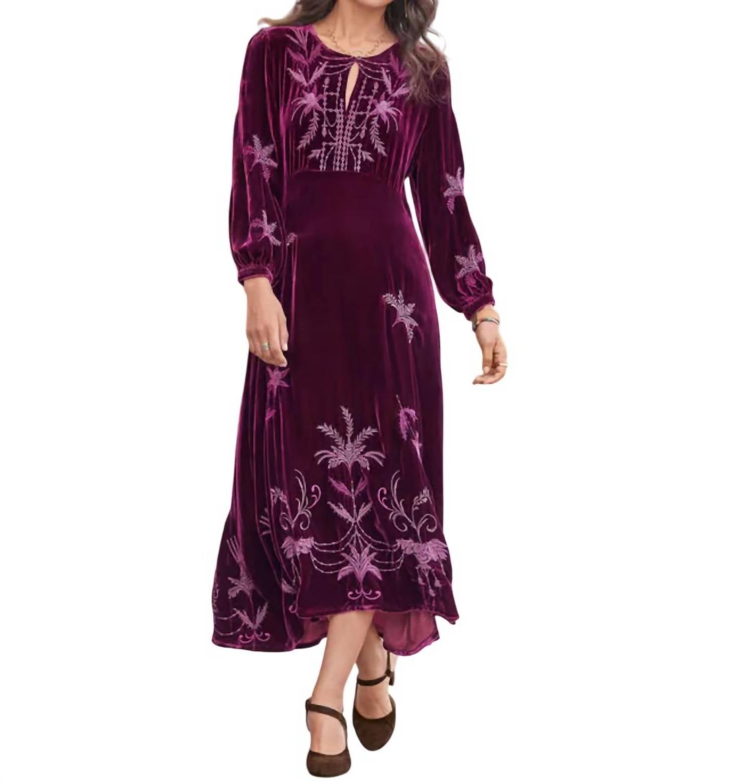 Apresentamos o Vestido Palmira Silk Velvet da Johnny Was, uma peça requintada em roxo intenso, criada para a mulher moderna. Este vestido, com mangas compridas, é confeccionado em uma luxuosa mistura de seda com 82% rayon e 18% seda, e apresenta uma elegante silhueta em corte A com um sofisticado decote em V. Decorado com padrões bordados intrincados, é a escolha perfeita para diversas ocasiões.