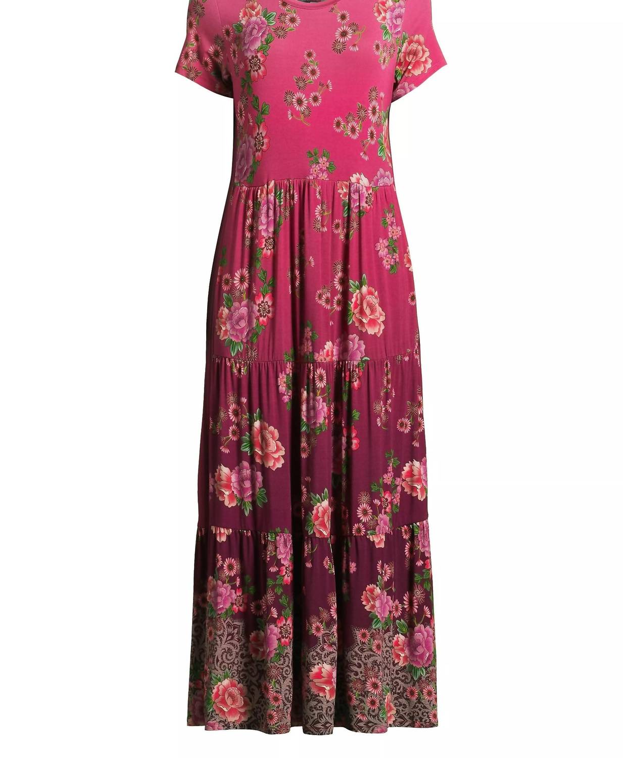 Um vestido midi tão versátil que suas opções de uso são infinitas. Este vestido midi apresenta uma estampa floral vibrante, mangas curtas, gola redonda e cintura com costura que se estende até a saia em camadas. Confeccionado em 95% rami e 5% elastano, mede aproximadamente 120 cm do ombro à bainha e é prático de usar com fecho pull-on. Fabricado em uma fábrica importada, requer lavagem à mão para manter seu charme delicado.