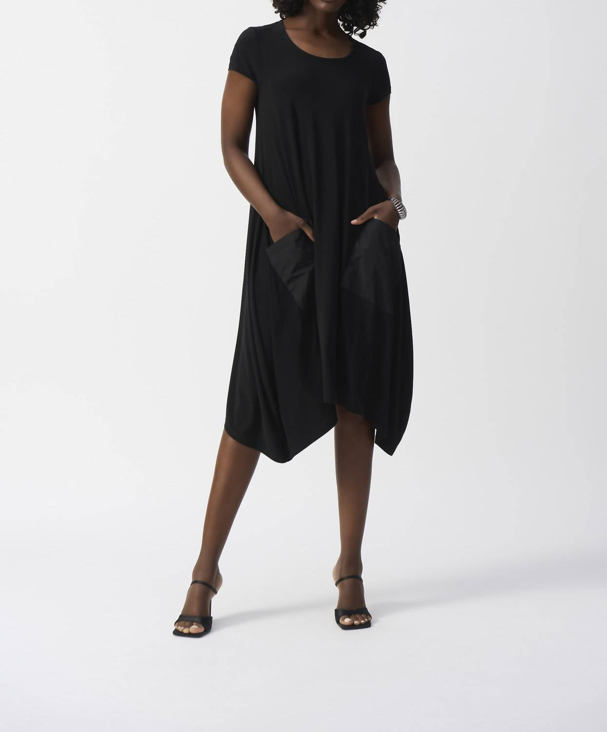 Elevate your wardrobe with the Silky Knit Cocoon Dress by Joseph Ribkoff, a chic black A-line piece perfect for summer outings. This asymmetrical dress features short sleeves and a versatile round neck, crafted from 96% polyester and 4% spandex for a comfortable fit. Practical front pockets and a back zip closure enhance its functionality, while the knee-length design adds to its elegance. Care for this unlined dress by hand washing and laying it flat to dry, available in approximate length 41" (size 12). Model height: 5'9" (175 cm) wearing size 6.