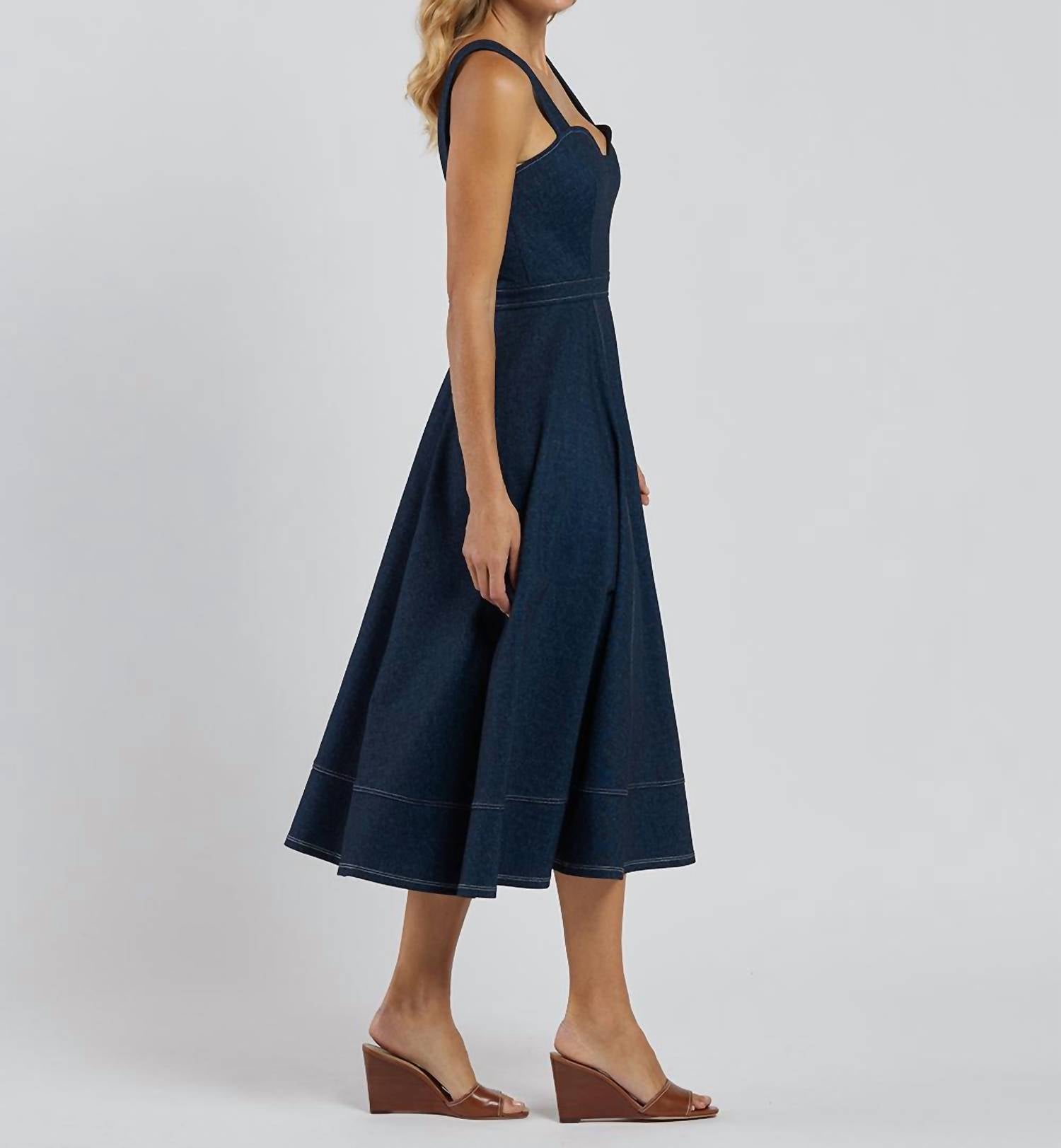The perfect length dress does exist. Elevate your wardrobe with the JUDE CONNALLY Sabrina Denim Fit And Flare Midi Dress, designed for versatile elegance. This sleeveless midi-length dress features a flattering sweetheart neckline with a distinctive navy color adorned by white contrast stitching. Crafted from a blend of Poly/Rayon/Spandex, it promises comfort and style for any occasion. Closure: Pull-on. Care: Machine wash cold, line dry, avoid bleach and fabric softener, cool iron if necessary. Made in the U.S.A. With a length of 37 1/2" from the top of center back in size small, this dress is a quintessential addition for events like anniversaries and spring celebrations.