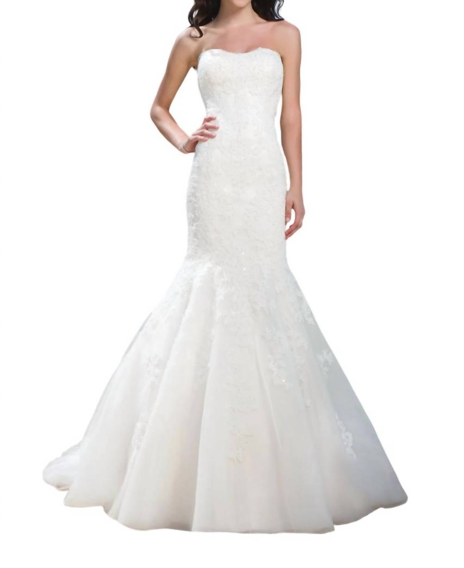 Rock your big day with this effortlessly chic wedding dress, designed with impeccable detail and fit to perfection. Say 'yes' to the dress and make it a day to remember. Introducing the Beaded Lace Mermaid Dress by Justin Alexander, a stunning choice for your special day. This strapless gown features a soft sweetheart neckline, complemented by a flowing tulle and organza skirt. Crafted in a solid white hue, it is designed with satin buttons elegantly placed over a zip closure. Best suited for weddings, this gown ensures timeless elegance from the chapel length train to the mermaid silhouette.
