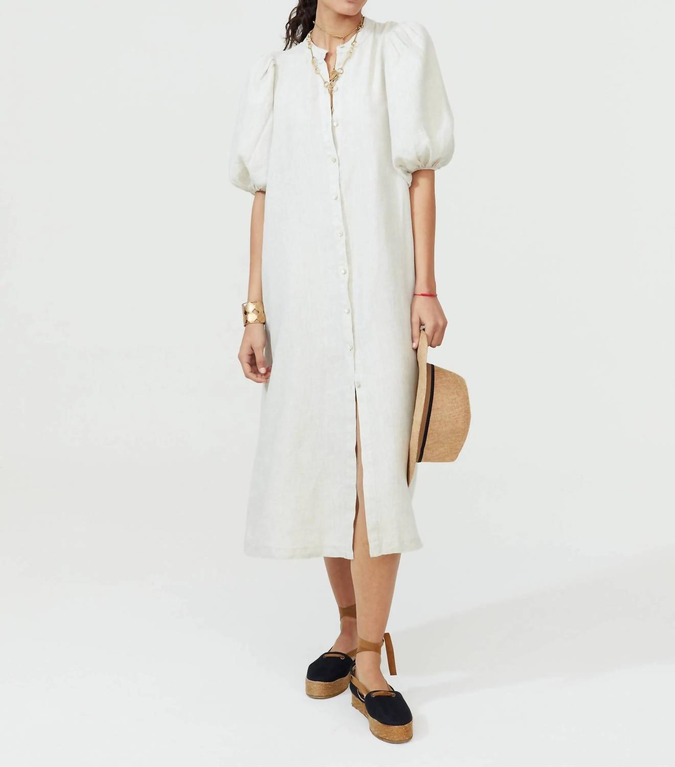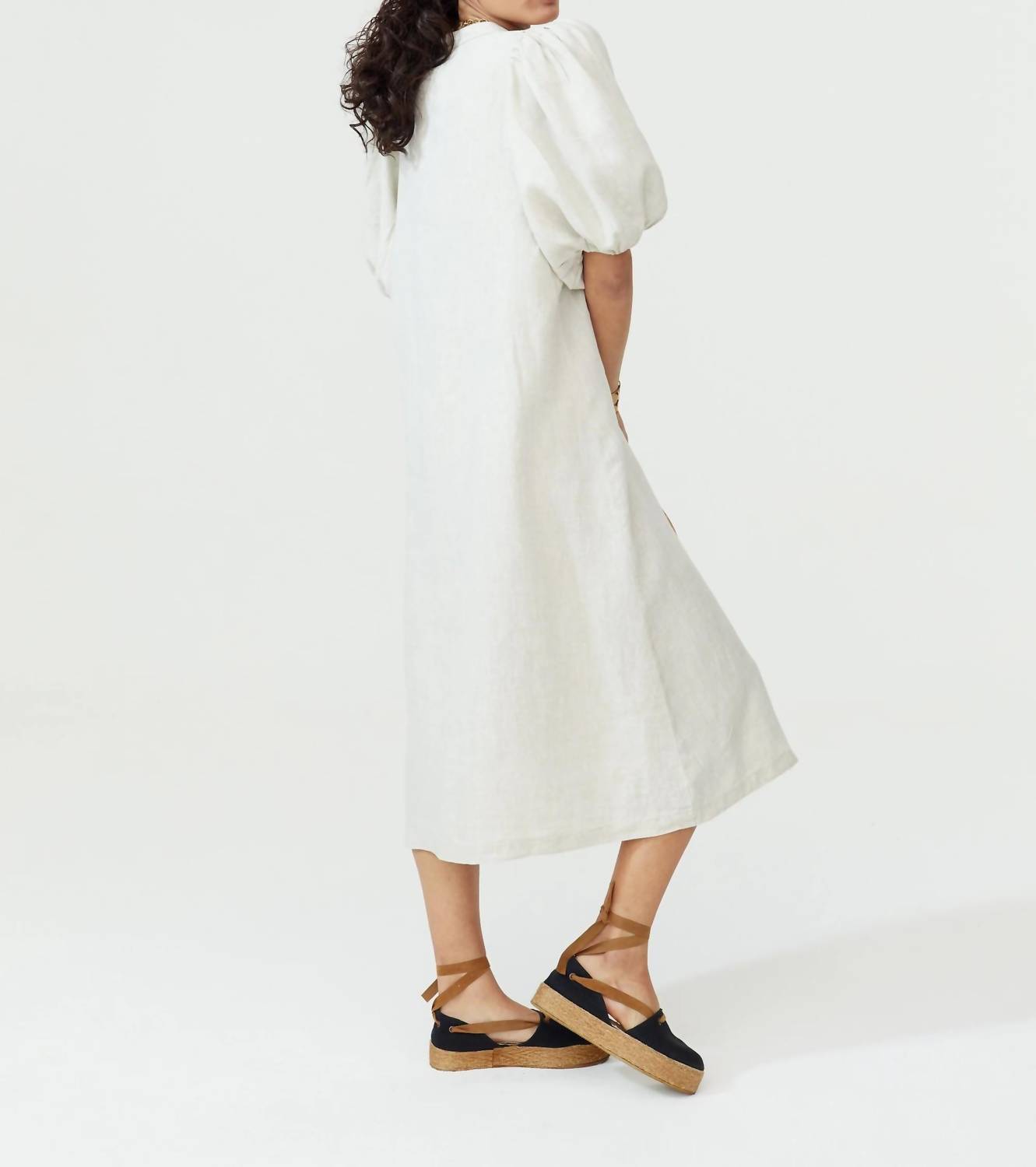 Discover the Bubble Linen Dress by Lanhtropy, a timeless piece in a natural hue that exudes elegance and comfort. Designed with elbow-length balloon sleeves and a mao neck, this dress crafted from 100% organic linen highlights an A-line silhouette for a flattering fit. With its front button closure and minimalist design, it's a perfect addition to your summer wardrobe. Care: Dry clean only.