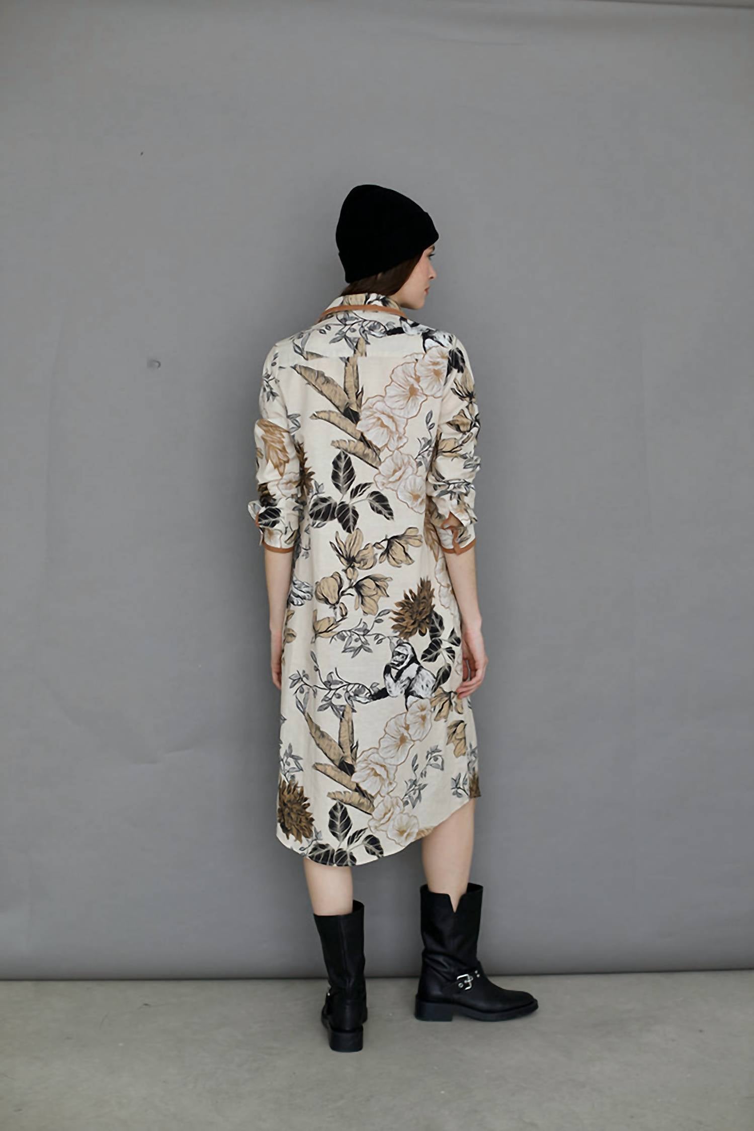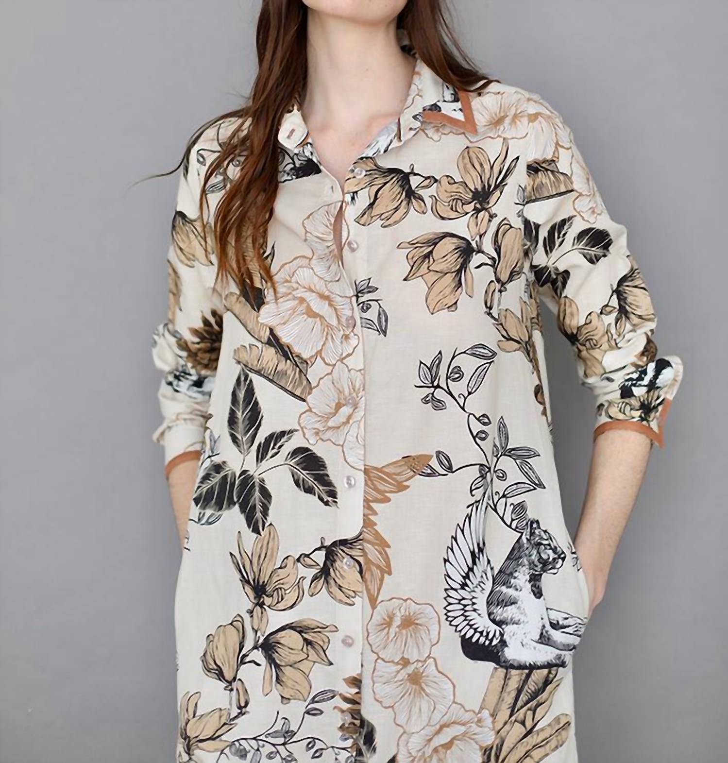 Just add slides or mules and you are good to go. Discover the Clara Portrait Tunic by Las Sureñas, a whimsical addition to your wardrobe featuring angelic tigers among floral and branch motifs in a beige hue. This women's tunic boasts a collared neckline and long sleeves with button cuffs, crafted from a lightweight, non-stretch linen blend (55% linen, 45% cotton) for breathability and comfort. Designed with a button closure and on-seam hip pockets, it offers both practicality and style with its relaxed fit. Perfect for Boho Chic occasions, it can be easily maintained by washing cold for lasting quality.
