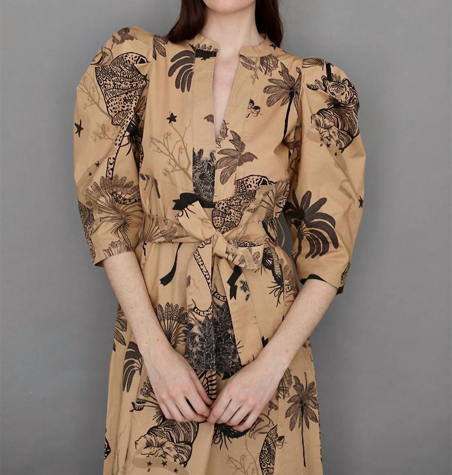 Embrace vintage charm with the Las Sureñas Toile De Jouy Long Dress in a delicate beige shade. This maxi dress features elegant elbow sleeves and is crafted from lightweight poplin fabric adorned with a Toile de Jouy print. Designed with a flattering A-line silhouette and feminine puffed sleeves, it includes a tie closure for a custom fit. Perfect for a spring dinner party or a semi-fancy night out.