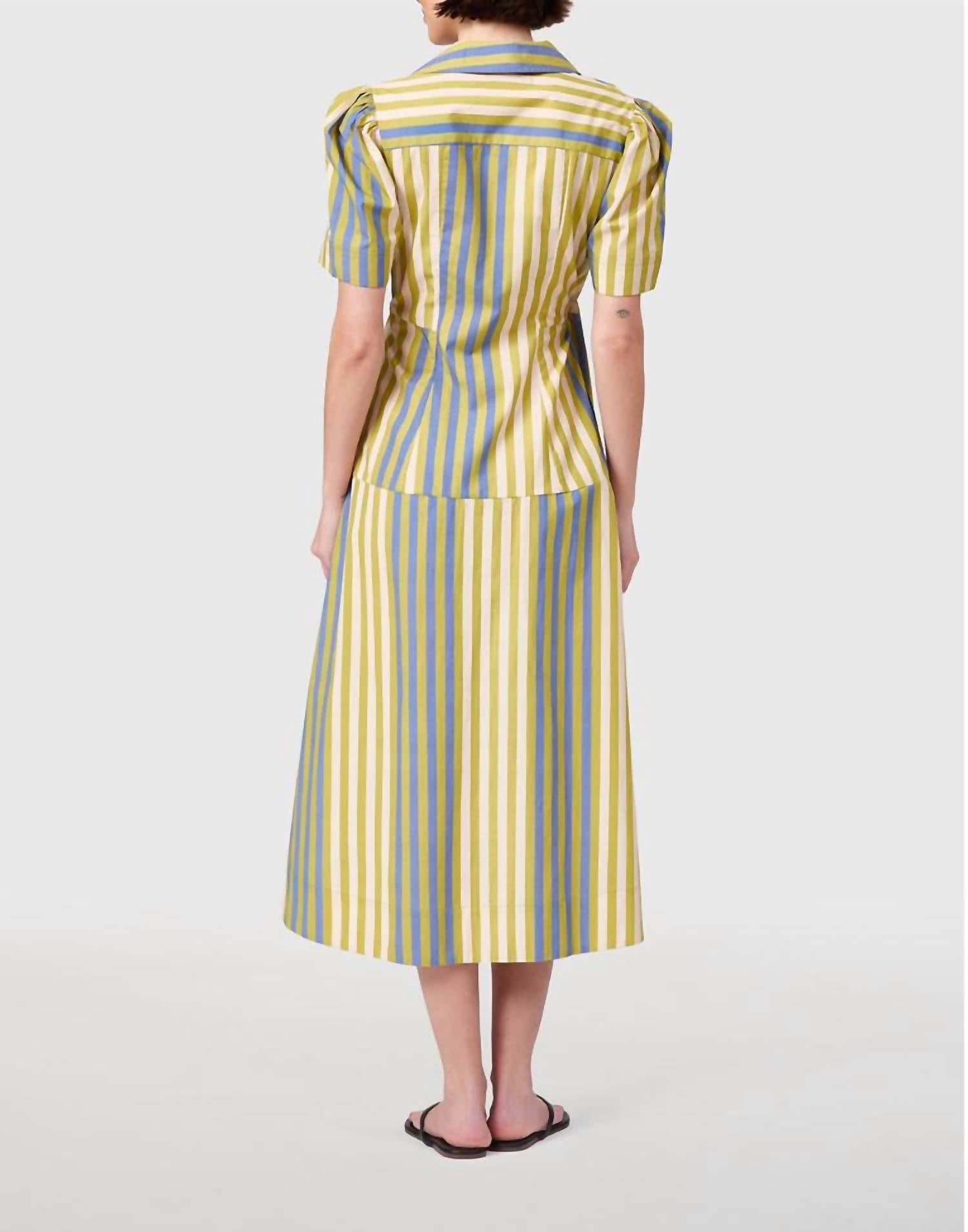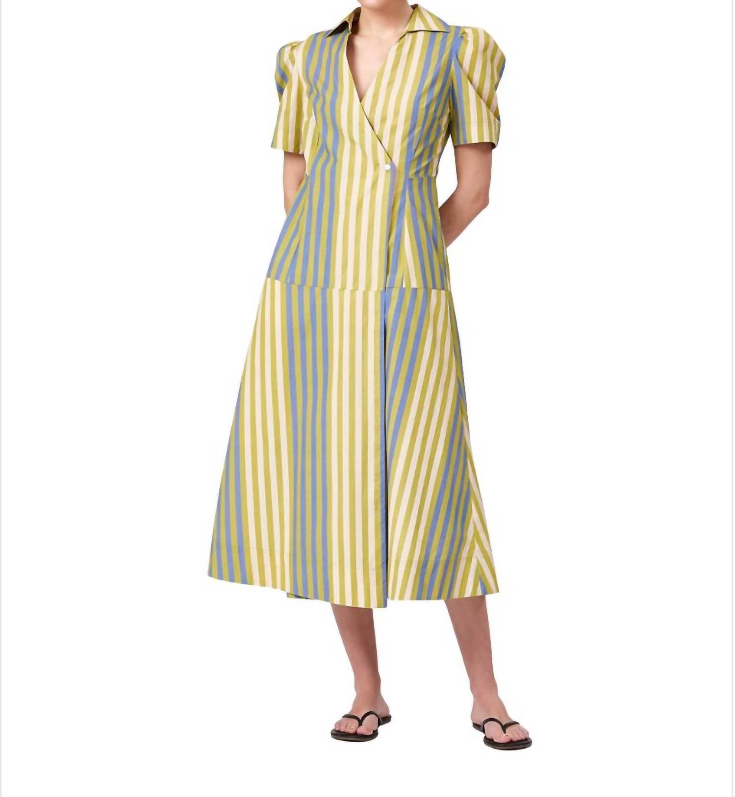 Discover the Clark V-neck Midi Dress by Livro, a stylish choice for any spring occasion. With its short puff sleeves and elegant A-line silhouette, this dress showcases a cross-over design in chic chartreuse stripes. Crafted from 100% cotton, it features a button closure for a refined finish. Made in Jaipur, India, this piece is best cared for by dry cleaning first to preserve color, followed by cold washing and hanging dry.