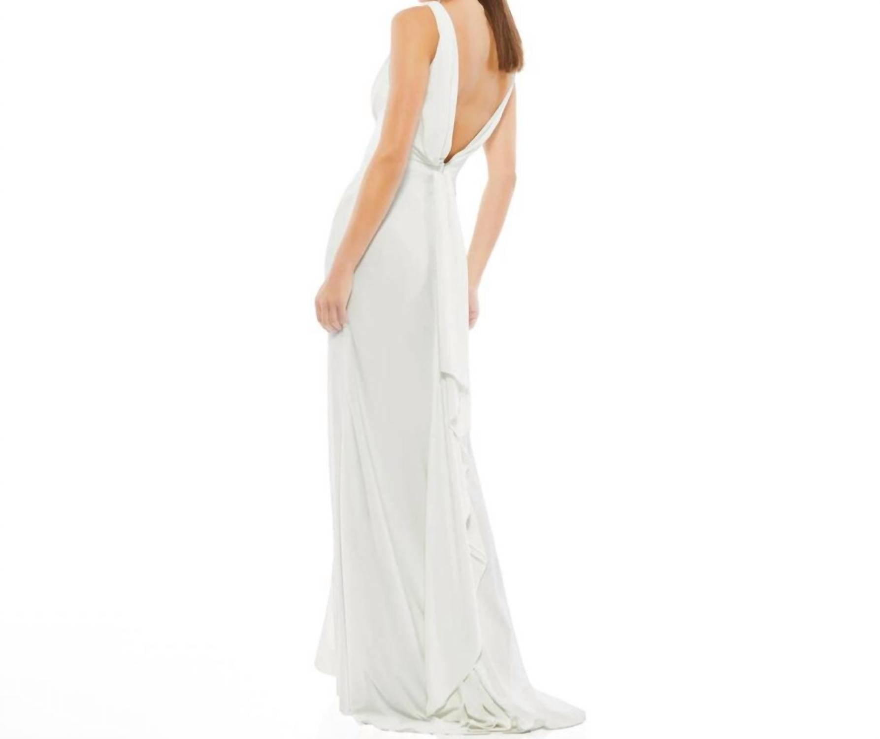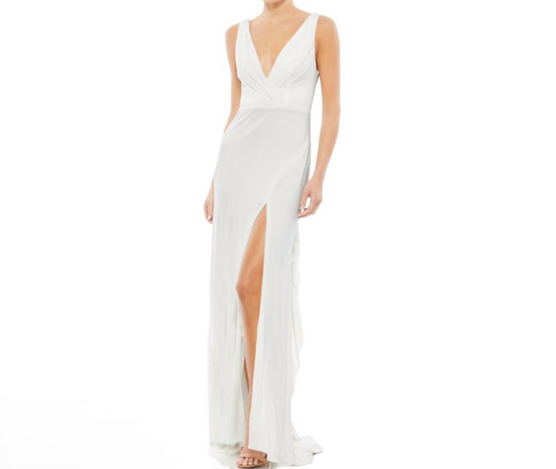 Eleve o seu look noturno com o Vestido de Jersey sem Mangas com Decote em V e Fenda, da MAC DUGGAL, uma escolha requintada para eventos femininos. Confeccionado em 100% poliéster, este vestido longo branco liso apresenta costas em V marcantes, cauda franzida e fenda frontal alta. Com um corte reto, oferece um estilo sofisticado com fecho de amarração. Com comprimento aproximado de 162 cm do ombro à barra, este vestido é uma opção deslumbrante para ocasiões de primavera.