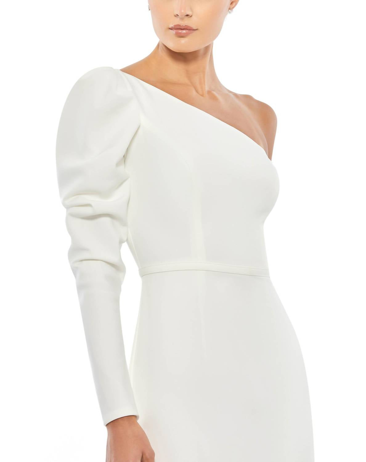 Eleve seu guarda-roupa formal com o Vestido de Um Ombro da Mac Duggal, uma peça marcante em branco atemporal. Com manga longa bufante e uma ousada fenda na altura da coxa, este vestido mede aproximadamente 158 cm do topo do ombro à bainha inferior, perfeito para casamentos e galas. Confeccionado com atenção aos detalhes, inclui um zíper invisível nas costas para um acabamento elegante. Feito com cuidado, este vestido forrado combina perfeitamente elegância com uma referência às tendências da moda dos anos 90.