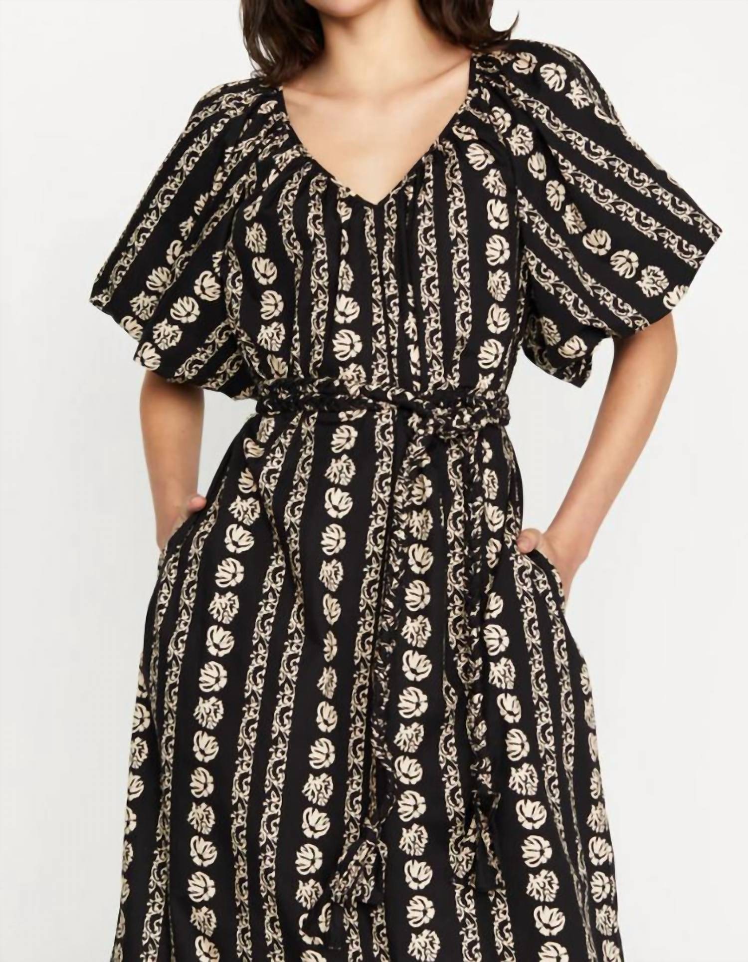 Just add slides or mules and you are good to go. Experience the charm of the Marie Oliver Foster Midi Dress, a perfect blend of playful design and classic elegance. With its short puff sleeves and a flattering midi length, this dress is made from lightweight 100% cotton and comes in the unique black and tan Raven Rows print. Closure is a simple pull-on style, while convenient pockets and an optional braided belt add to its functional artistry. Ideal for travel and inspired by 90s fashion trends, it's a wardrobe must-have for the modern woman.