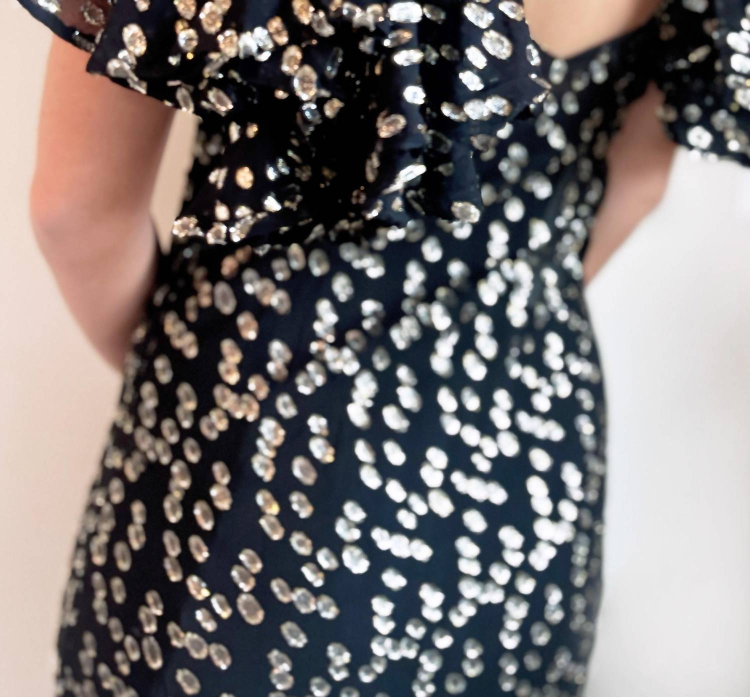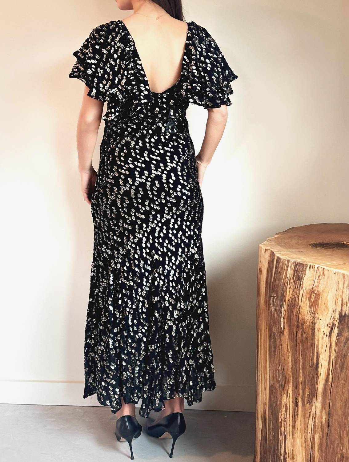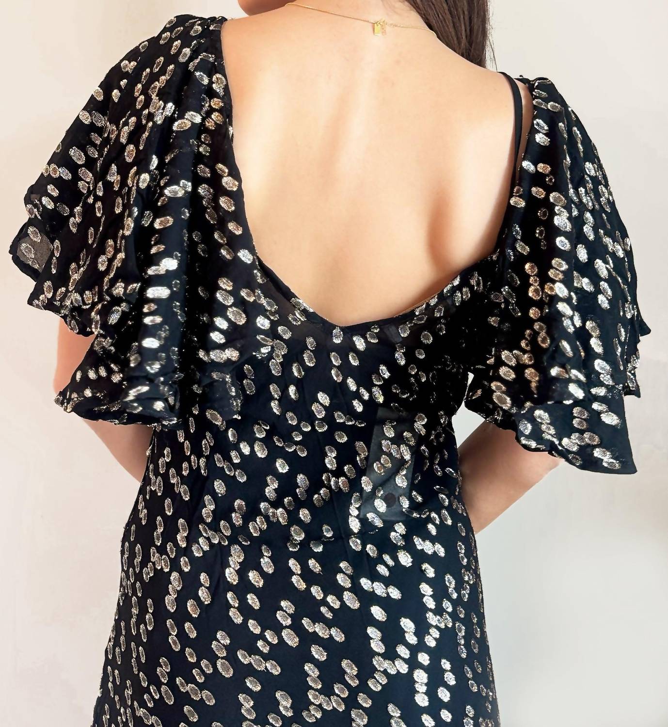 Style this maxi with your favorite statement necklace and sandals for the perfect look. Introducing the Ramya Maxi Dress by Natalie Martin, an exquisite piece for any evening event, especially perfect for New Year's Eve. This dress features a v-neckline and elegant double-flutter short sleeves, crafted from metallic chiffon that exhibits a subtle sheen with its patterned design. The sheath silhouette is fitted from the bust down, flaring gently at the ankle, adding a touch of quiet luxury to your wardrobe. Crafted with a pull-on closure for easy wear.