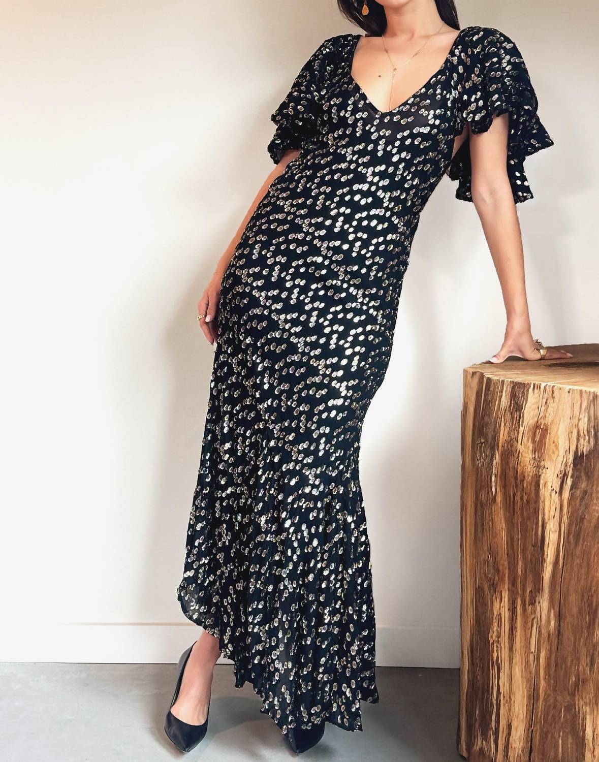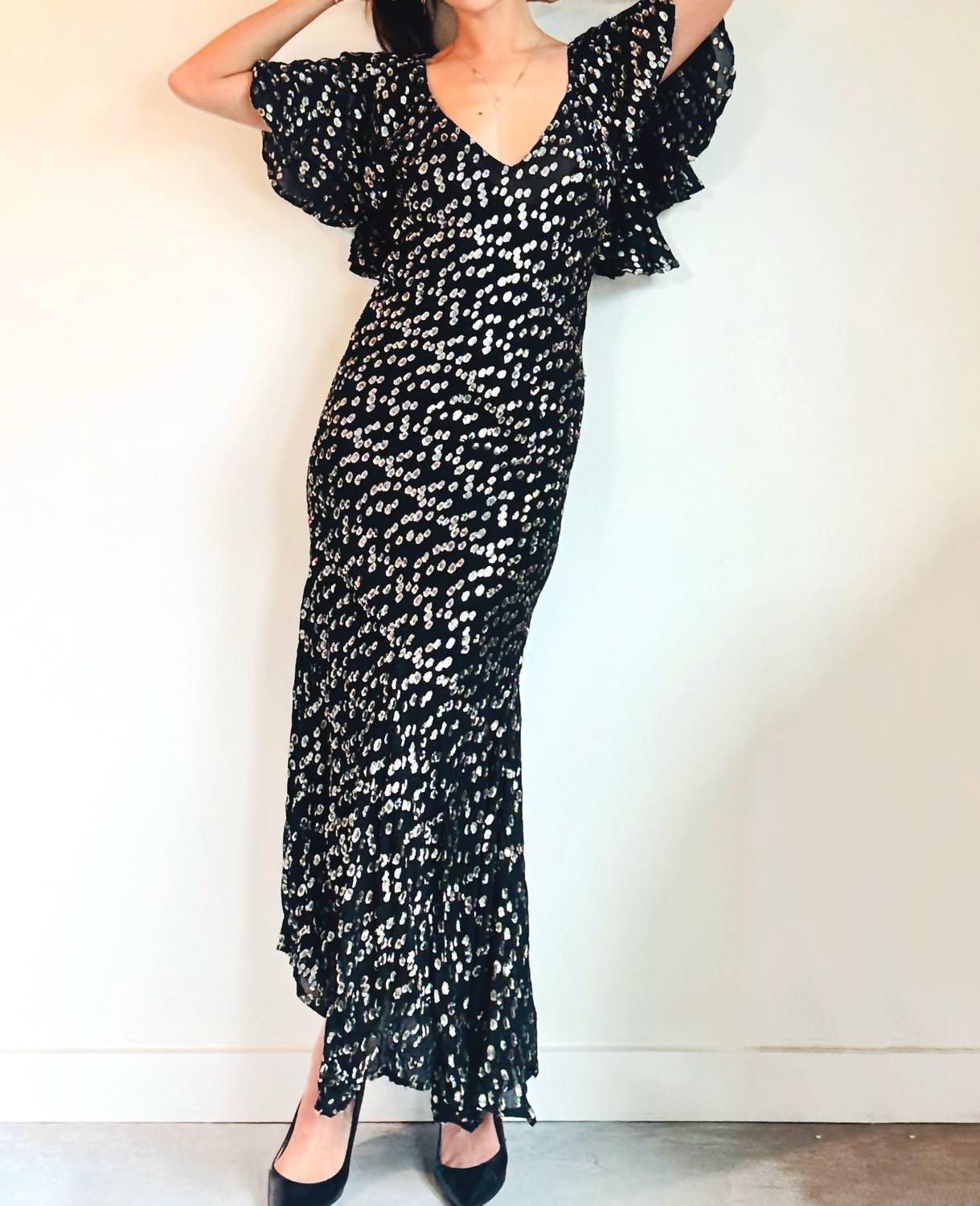 Introducing the Ramya Maxi Dress by Natalie Martin, an exquisite piece for any evening event, especially perfect for New Year's Eve. This dress features a v-neckline and elegant double-flutter short sleeves, crafted from metallic chiffon that exhibits a subtle sheen with its patterned design. The sheath silhouette is fitted from the bust down, flaring gently at the ankle, adding a touch of quiet luxury to your wardrobe. Crafted with a pull-on closure for easy wear.