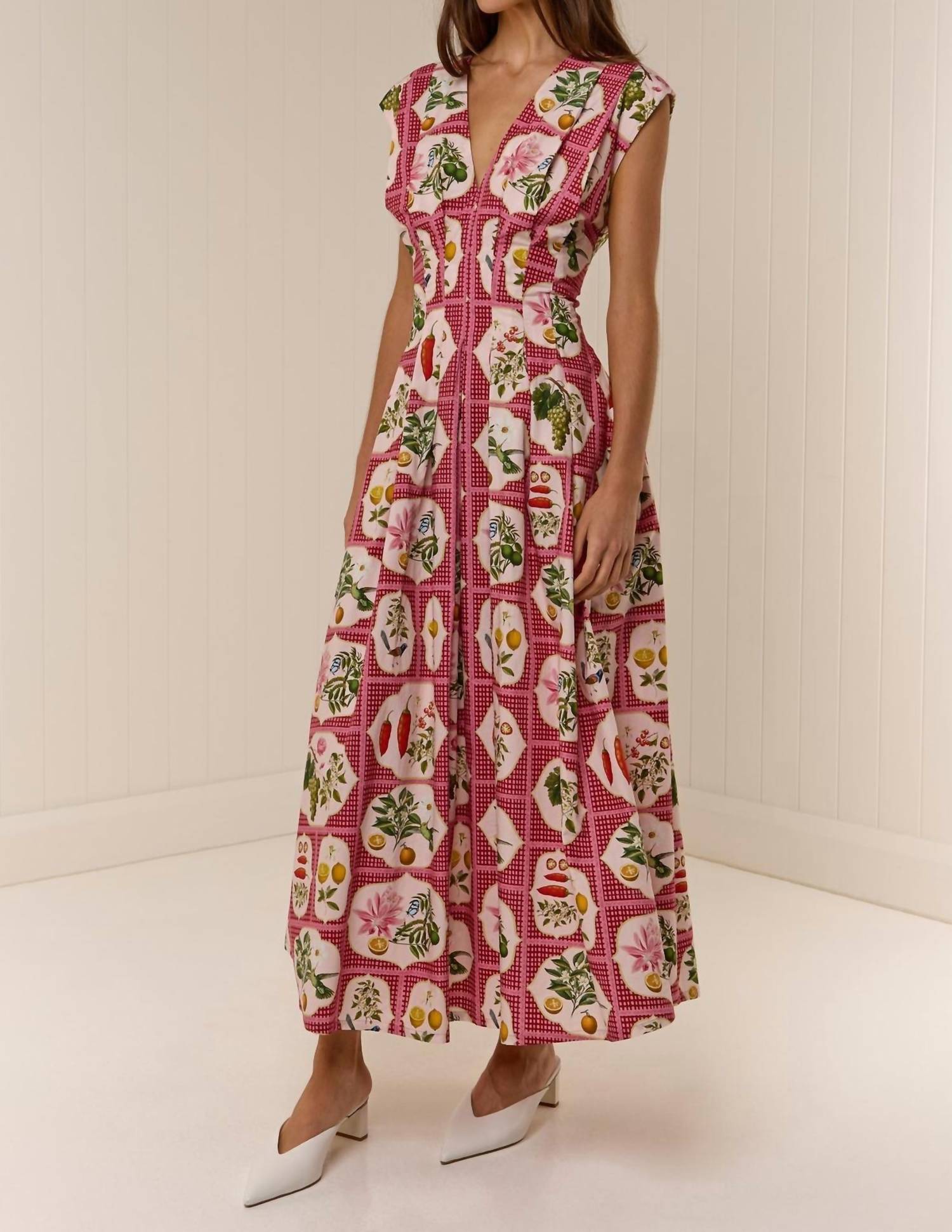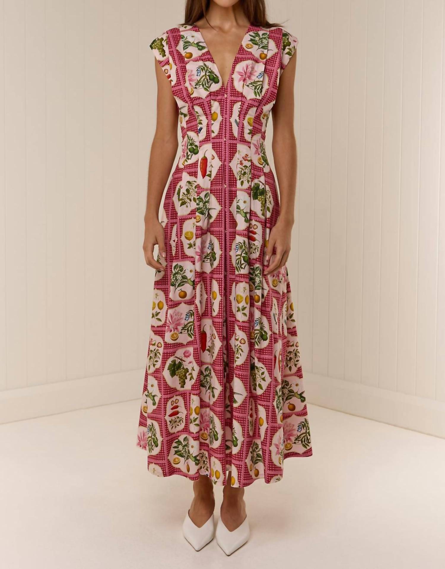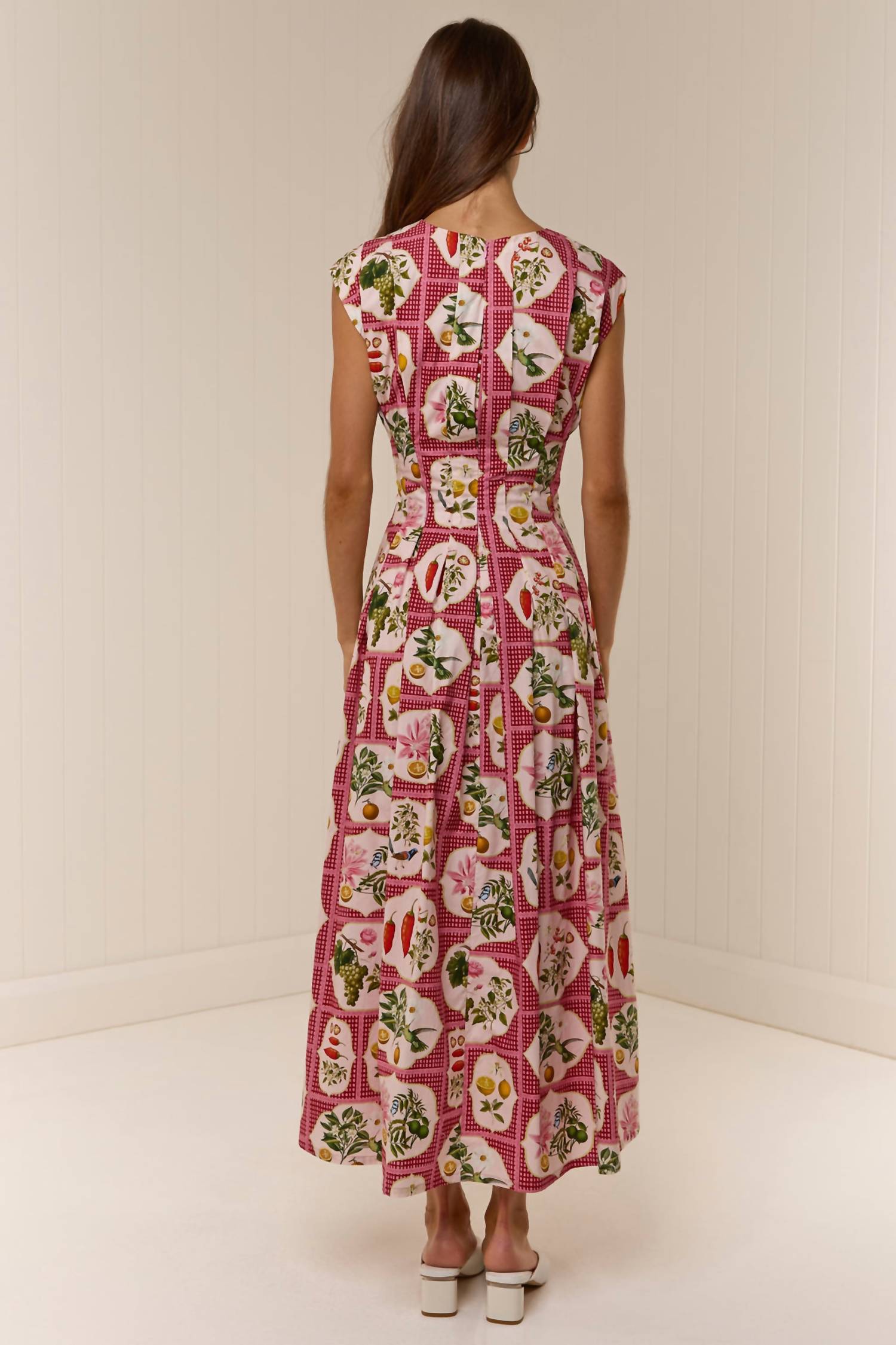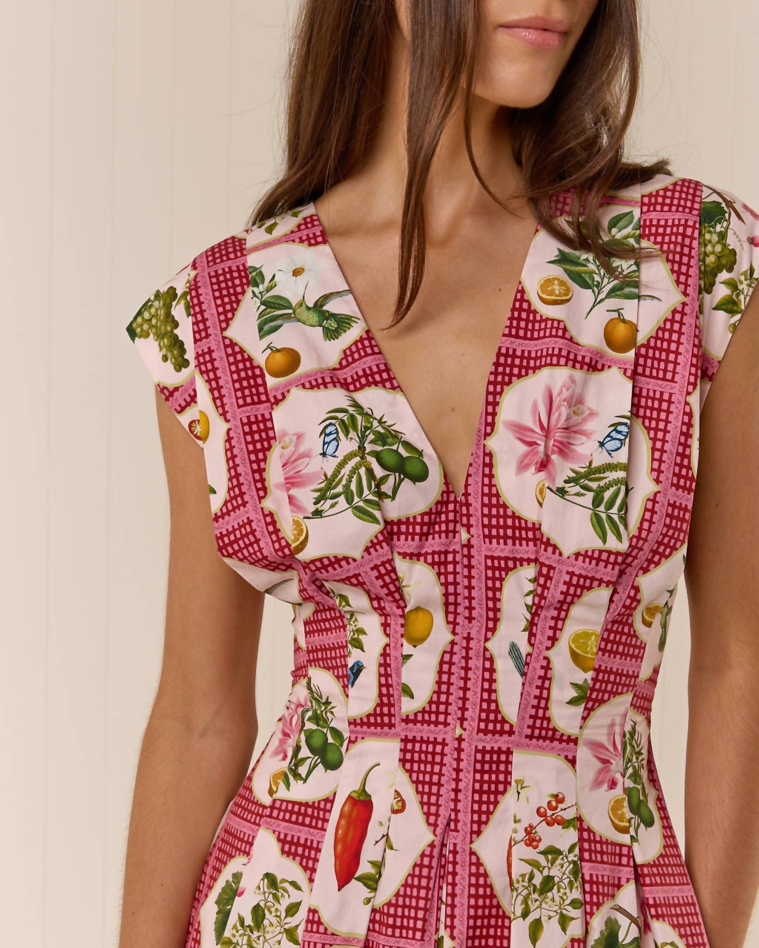 A midi dress so versatile, your options for wearing it are endless. Introducing the Carter Dress by Palm Noosa, a chic embodiment of contemporary femininity and bohemian charm. This dress features short cap sleeves, a flattering V-neck, and side pockets for added functionality. Crafted from 100% cotton poplin in a striking red and white citrus tile print, it offers a comfortable fit with its midi length and tucked waist detailing. Closure: Hook and eye. Care: Dry clean only.