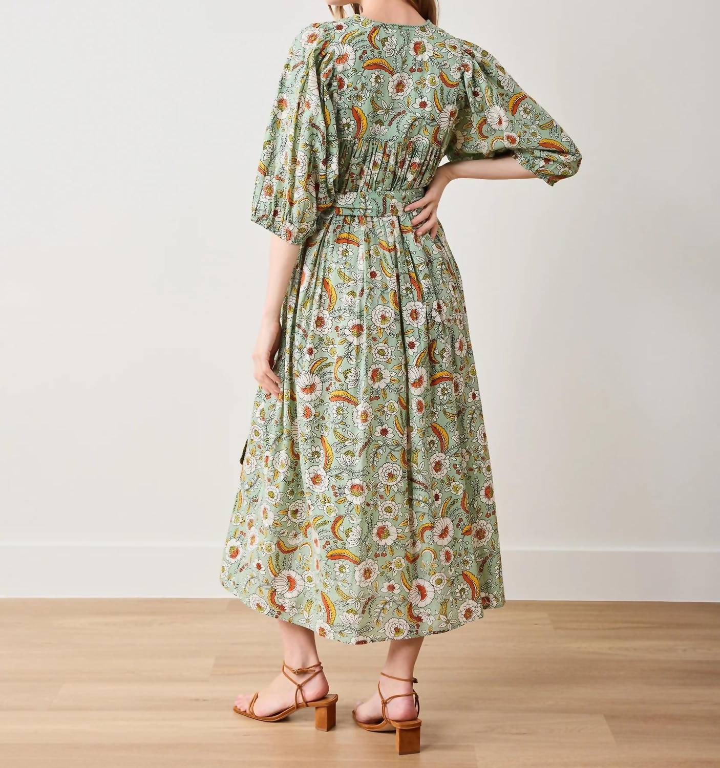 A midi dress so versatile, your options for wearing it are endless. Introducing the Artifact Midi Dress by Printfresh, a vibrant vacation-ready piece in a patterned green hue. This women's A-line dress is crafted from 100% organic cotton cambric, featuring a hand-smocked bodice and three-quarter sleeves for a maximalist spring look. Pockets add practicality, while adorable pom-pom trims and tassels accentuate its playful design. With a pull-on closure, it is easy to wear, and for care, launder on delicate with like colors, tumble dry on low heat, and press lightly or steam for elevated occasions.