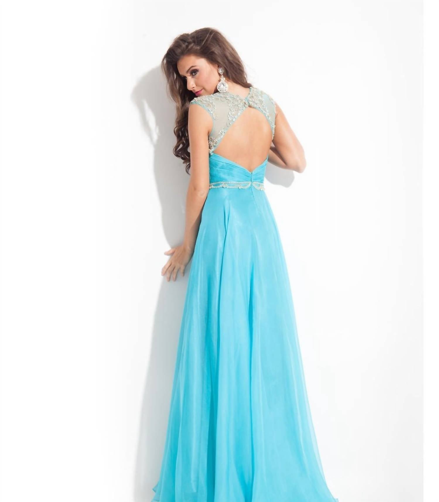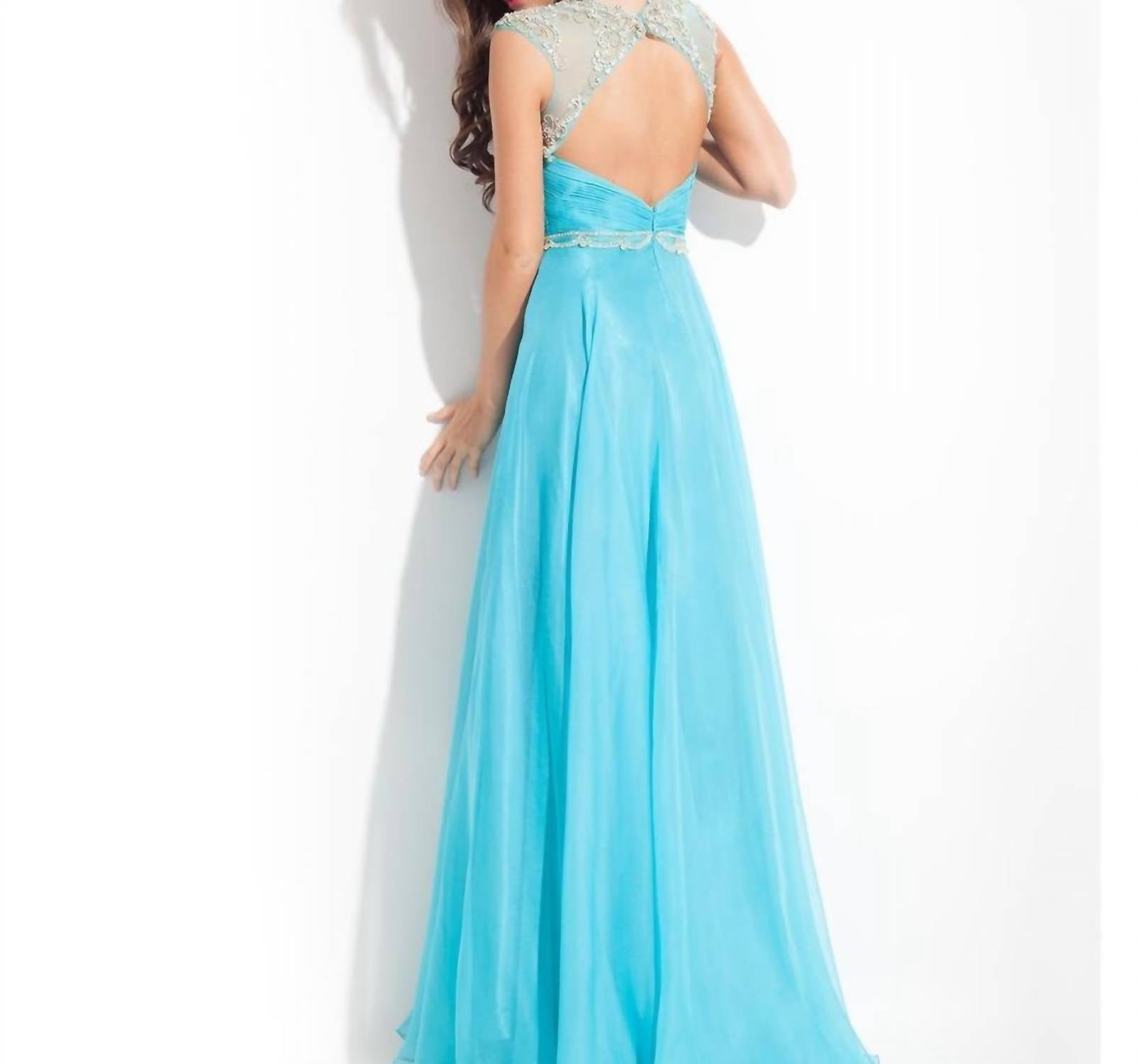 Turn heads in the cutest and most flattering evening dress. Introducing the Beaded High Mesh Neckline Chiffon Gown by RACHEL ALLAN, a stunning soft blue creation perfect for prom. This gown features cap sleeves and an exquisitely beaded high mesh neckline, complemented by a flowing chiffon skirt and an open back design. The silhouette is A-line, designed to flatter, with a convenient zip closure. Elevate your evening look with this elegant choice.