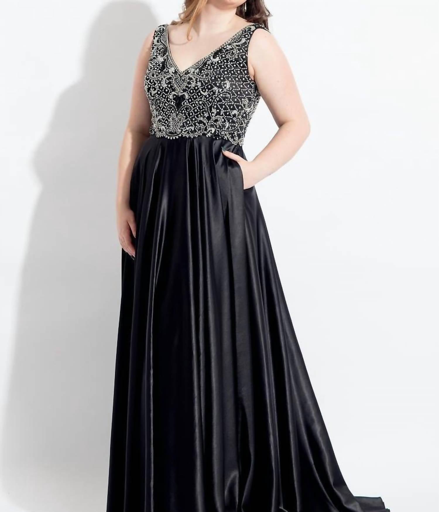 Just add a cute little clutch and a matching heel for the perfect event look. Make a statement at your next event with the Beaded Stretch Satin Flowy Prom Gown by Rachel Allan in timeless black. This sleeveless gown boasts a glamorous beaded bodice with a v-front and v-back neckline, perfectly complementing the fit and flare silhouette. Made from luxurious satin, it features a full-length flowy pleated skirt and practical side pockets. Closure: Zip closure.
