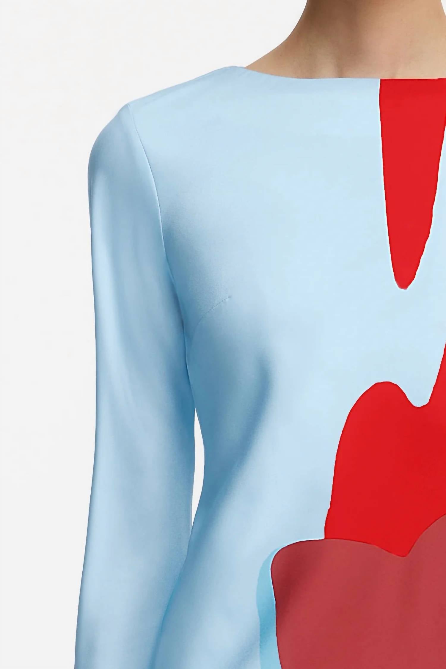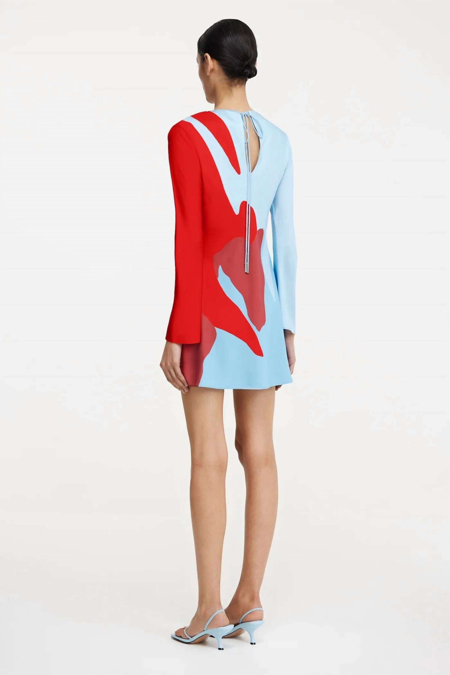 The perfect mini dress for those warmer months. The Alia Mini Dress by Significant Other in Crimson Stencil is the perfect choice for a striking spring look. This satin mini dress boasts long flared sleeves and features a graphic placement print that catches the eye. Crafted from 100% polyester in a sheath silhouette, the dress highlights a boatneck and secure tie closure with intricate rouleau ties and a keyhole back. Ideal for a holiday party, this unlined piece embodies the quiet luxury trend effortlessly. Model sizing: 178 cm / 5'10" wearing an AU 8 / US 4.