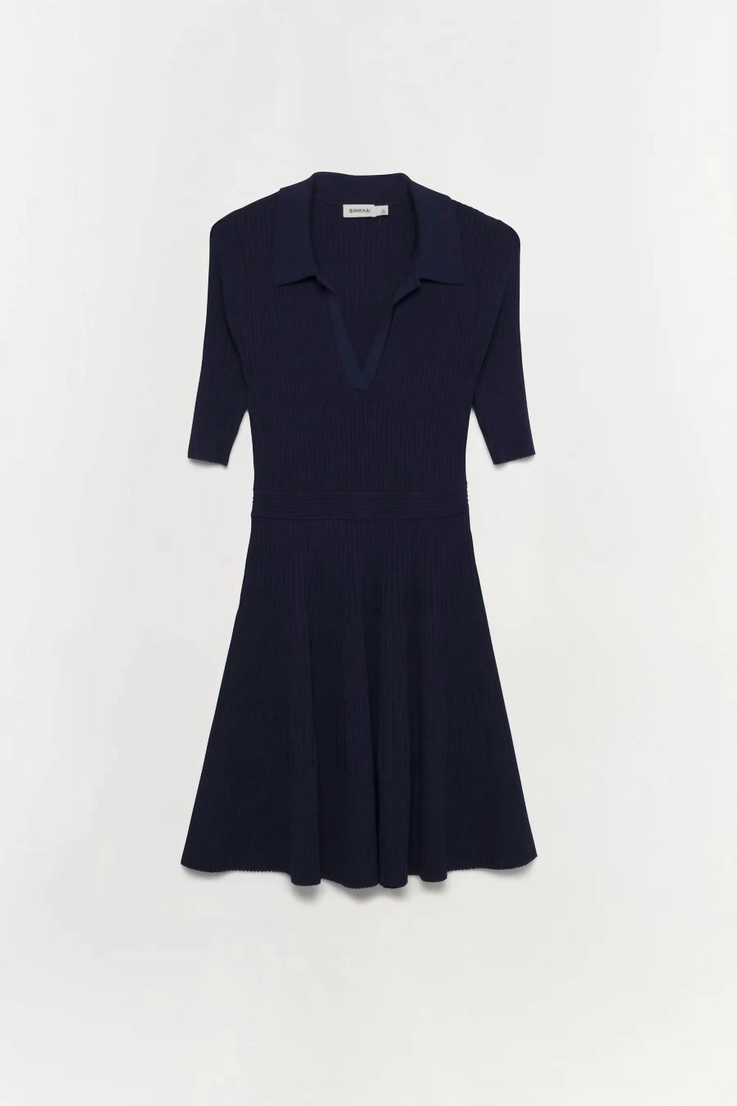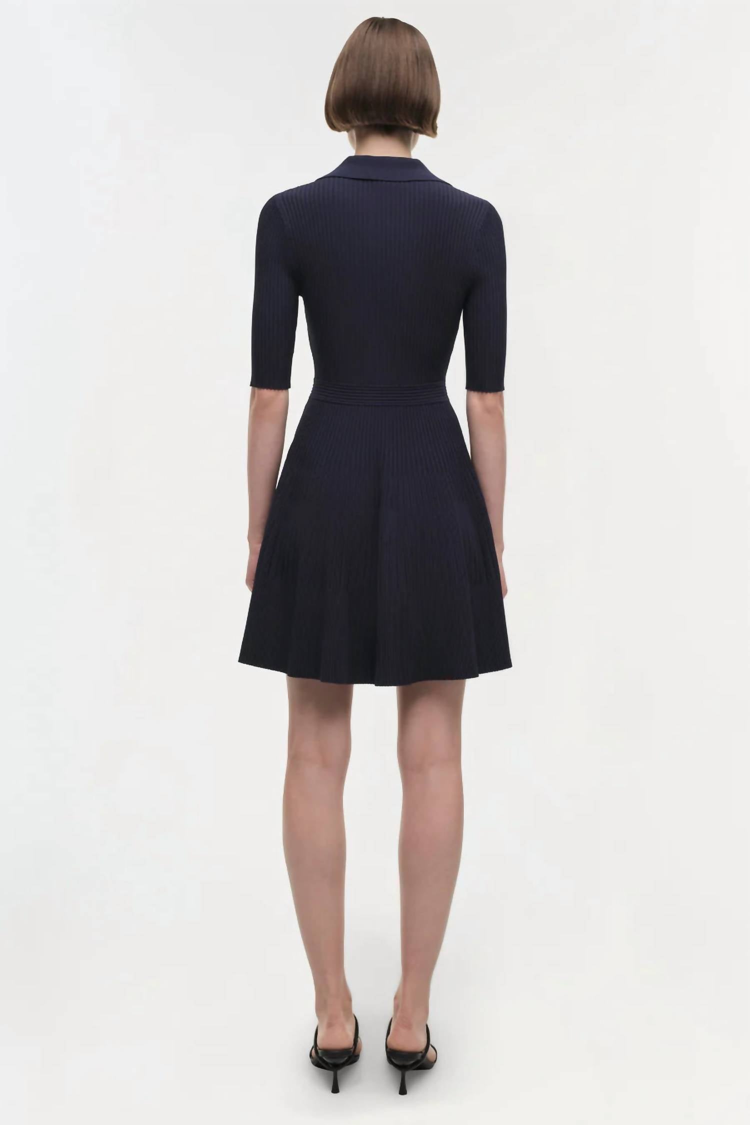 The kind of easy and flattering dress you'll be reaching for all season long. Introducing the Patricia Polo Mini Dress by SIMKHAI, a stunning piece in a rich Midnight hue that's perfect for any vacation occasion. This dress features short sleeves and an elegant V-neckline, complemented by a classic collar. The textured nylon blend material (66% Rayon, 33% Nylon, 1% Spandex) enhances this A-line silhouette, while the playful pleated skirt and cinched waist add a touch of charm. Closure is a convenient pull-on style, and care is dry clean only.