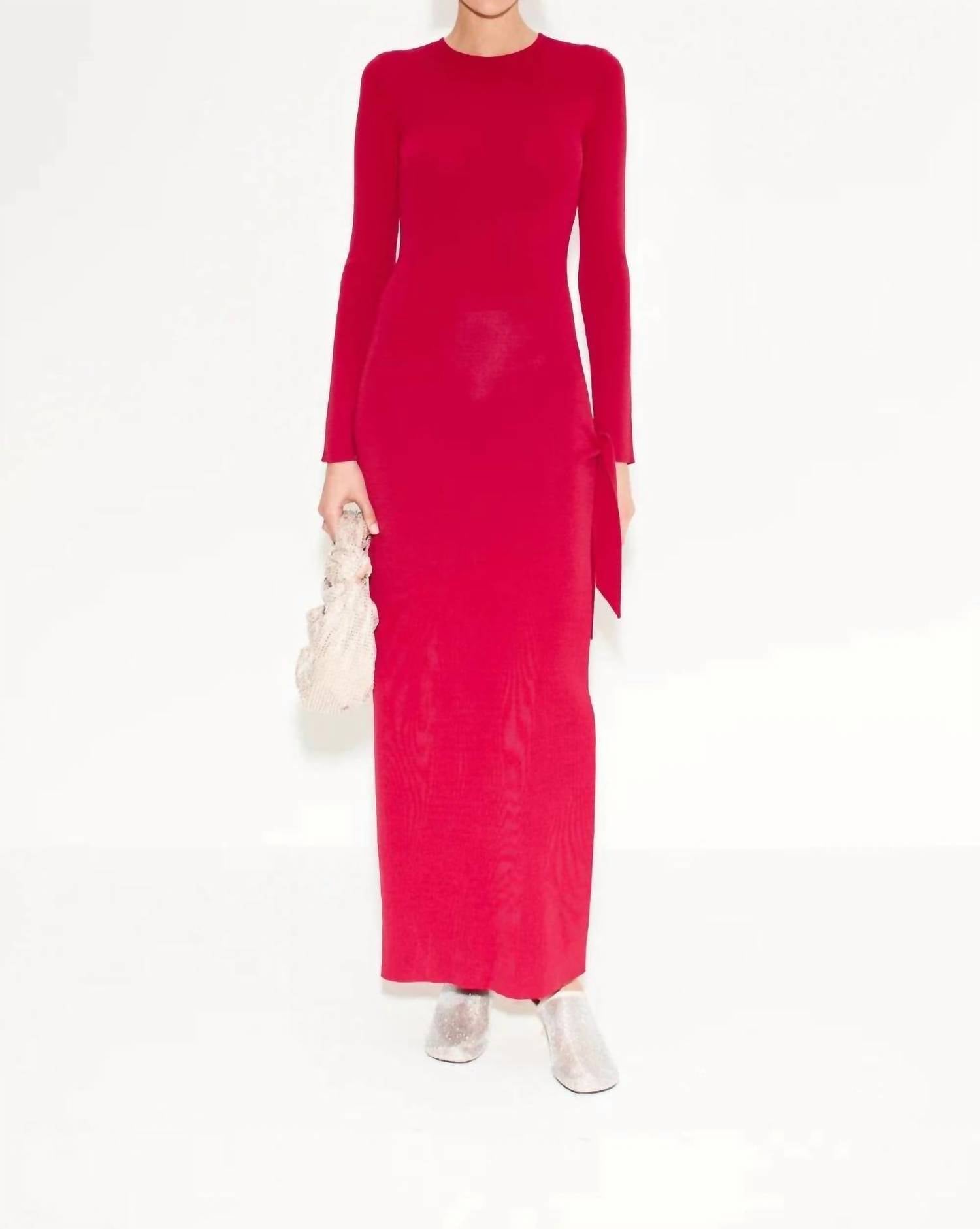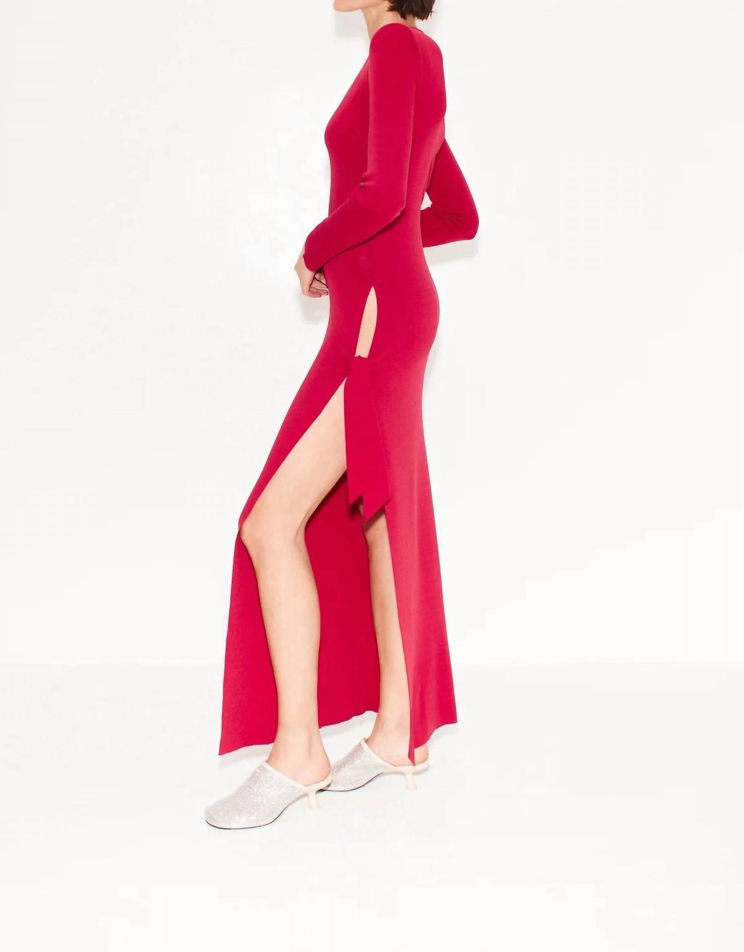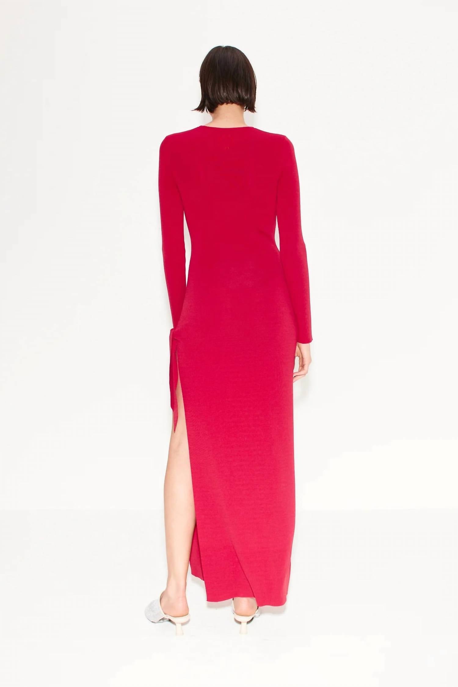 Quem não ama um bom vestido longo? Este você vai usar em todas as estações. O Vestido Longo Junjo de Malha com Manga Longa da SIMON MILLER é uma adição sofisticada ao seu guarda-roupa, perfeito para quem trabalha com criatividade. Este vestido justo na marcante cor Sangria apresenta uma fenda lateral alta e um detalhe de nó no quadril, adicionando um toque chique ao seu look de noite. Com uma composição de 65% Viscose e 35% Nylon, oferece um toque compacto e leve para eventos de outono. Fechamento: Estilo pull-on. Cuidados: Lavar à máquina com água fria, secar em temperatura normal, passar a ferro em temperatura baixa.