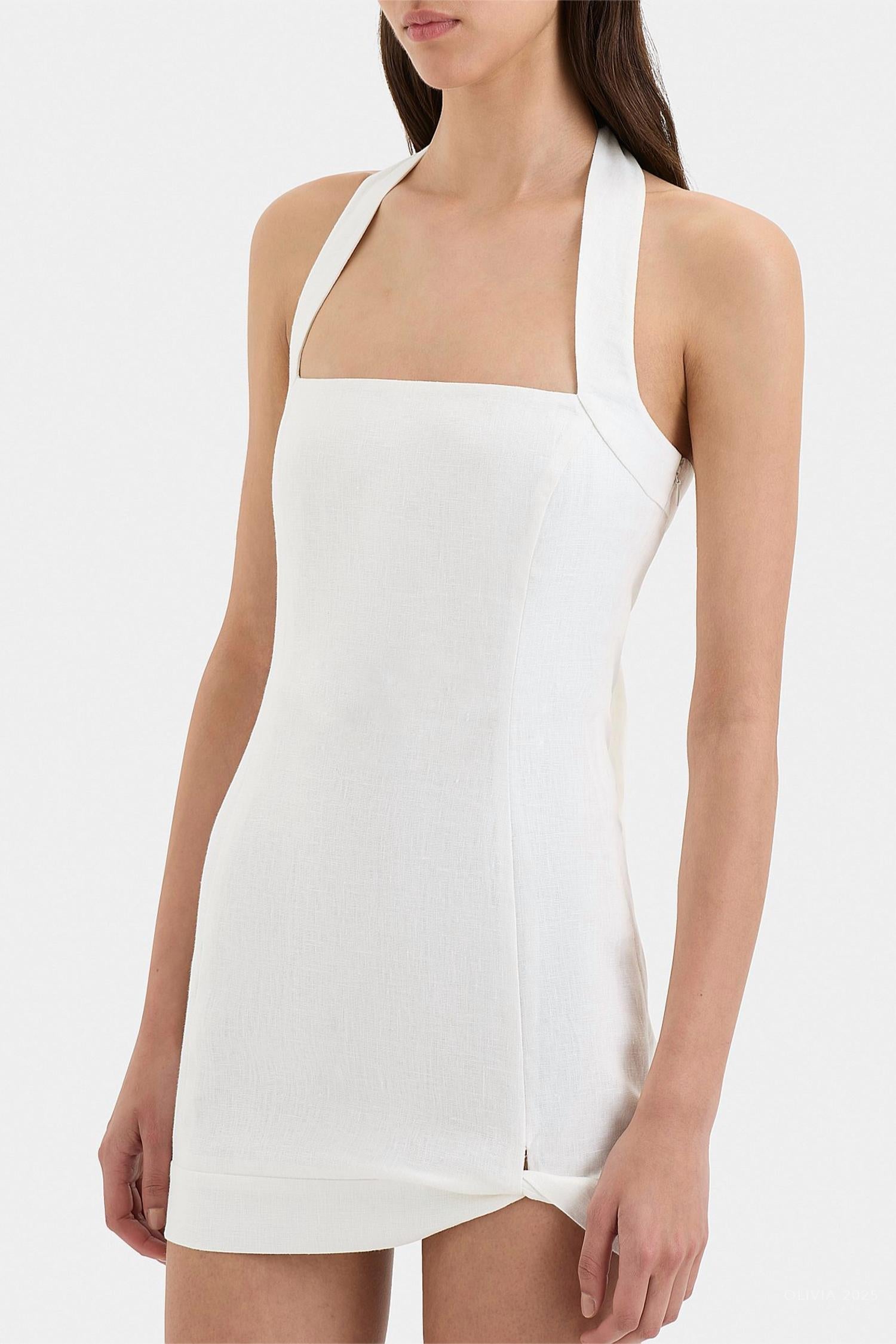 Introducing the Roisin Mini Dress by SIR., a chic addition to your cocktail party wardrobe with its minimalist, solid ivory design. This sleeveless, A-line halter dress is crafted from 100% linen, offering both style and breathability. It features a pull-on closure and is expertly imported, embodying sophisticated elegance for any spring occasion. Care instructions suggest a dry clean for optimal garment care.