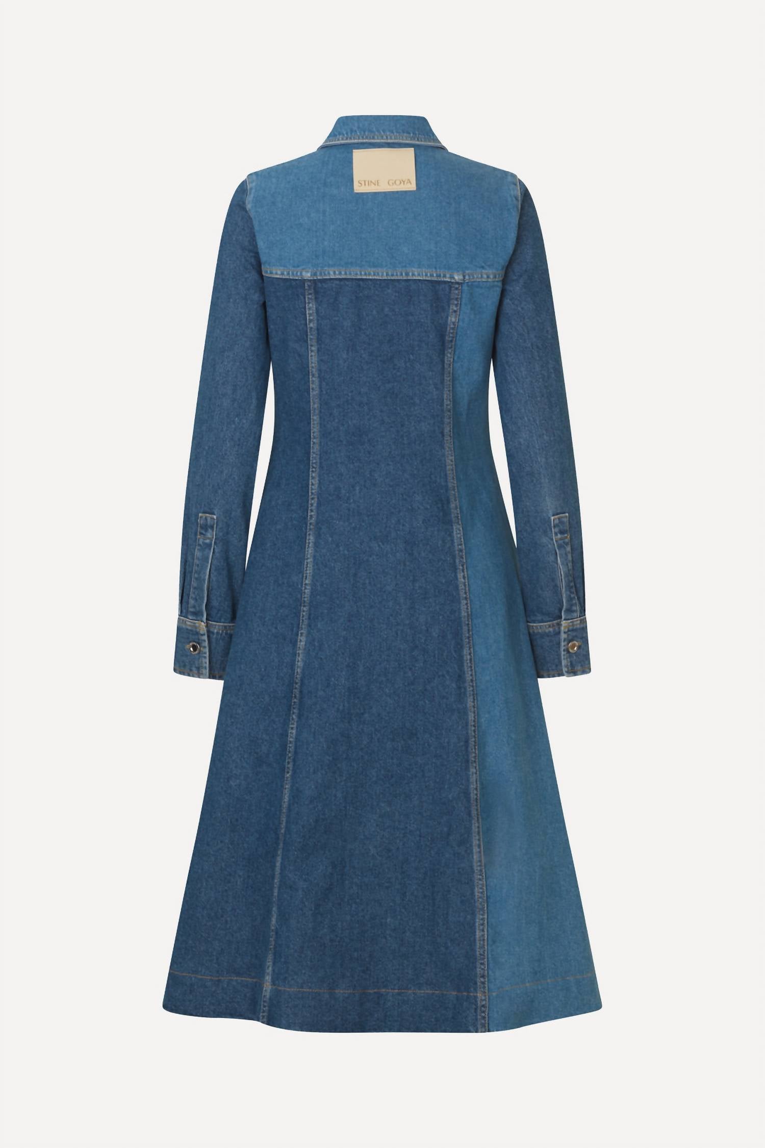 Introducing the STINE GOYA Long Sleeve Two Tone Denim Dress, a stunning piece perfect for a holiday party or any preppy occasion. This midi dress features long sleeves with cuffs and a classic shirt collar, enhanced by the elegant panelled two-tone design. Made from 100% organic cotton, it includes convenient welt pockets at the chest and a signature button closure for easy wear. For care, simply machine wash and tumble dry to maintain its crisp denim texture.