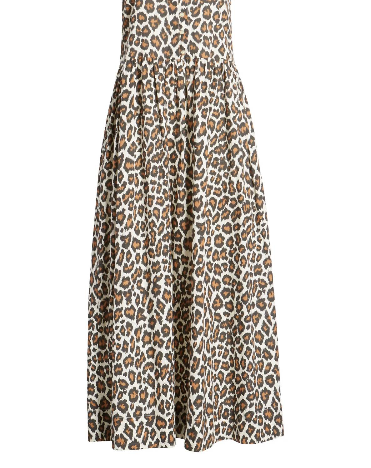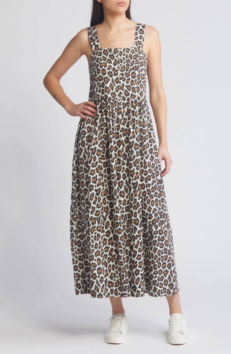 Apresentando o ÓTIMO Vestido Sunbird, um item essencial para o verão em estampa Heritage Leopard. Este maxi sem mangas é confeccionado em 100% algodão com textura de listras leves. Com decote quadrado e fecho de botão, sua cintura ajustada e franzido suave oferecem um caimento elegante que flui para a bainha logo acima do tornozelo. Cuidados: Lavar à máquina com água fria e secar em temperatura baixa.