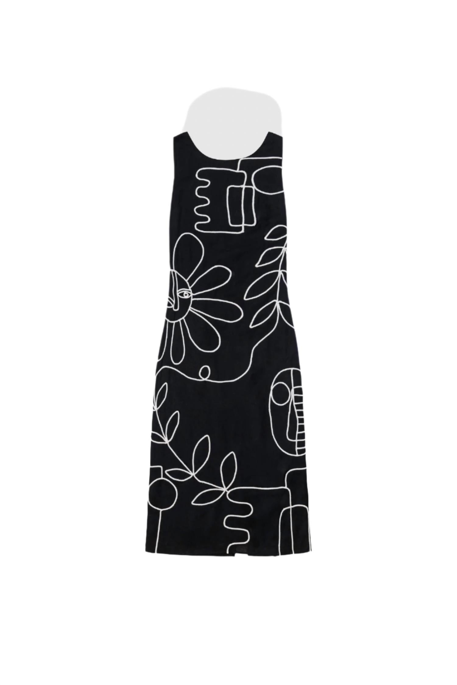 Introducing the Luna Maxi Dress by The Wolf Gang, an elegant sheath silhouette perfect for a minimalist wardrobe. This dress, featuring a maxi length and waist tie, showcases black fabric with white floral embroidery and a round neck for a sophisticated look. Crafted from a breathable blend of 70% cotton and 30% linen, it includes a back zip closure for easy wear. Perfect for summer soirées, this stylish piece is designed to be both timeless and chic, making it ideal for dinner parties or New Year's Eve celebrations.