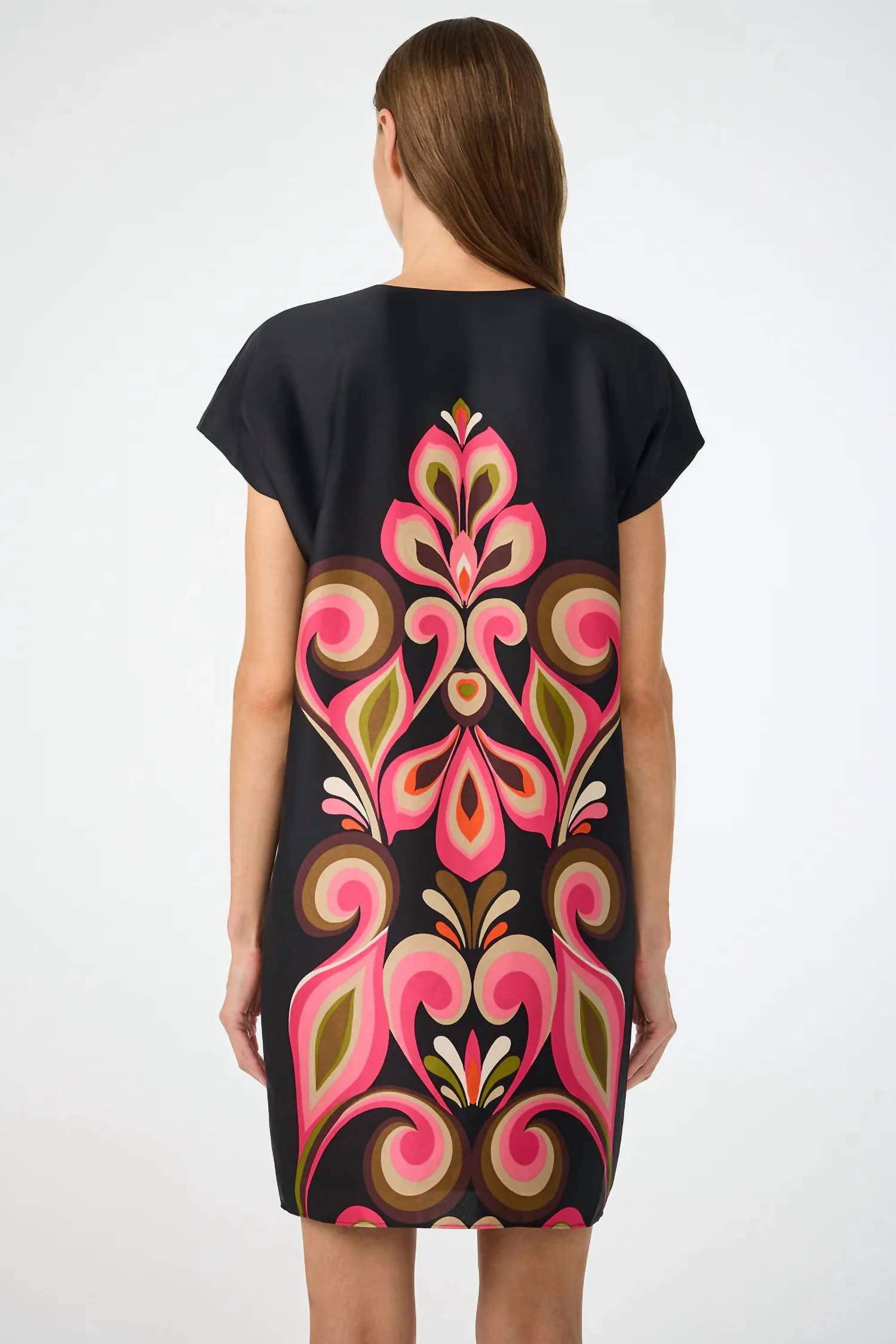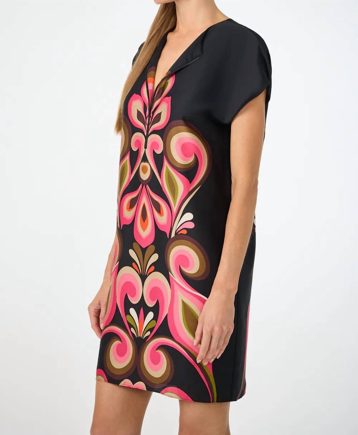 Introducing the Hasil 3 Short-sleeve Shift Dress by Trina Turk in a captivating Sanctuary graphic print. This chic mini dress features short sleeves with an extended shoulder, a crewneck, and a sophisticated half-zip front. Made from 100% polyester and designed in a versatile shift silhouette, it's an ideal pick for your next holiday party or spring event. Care is effortless with machine wash instructions, and the dress runs true to size with a model wearing size S (5'10.5", 34" bust, 24" waist).