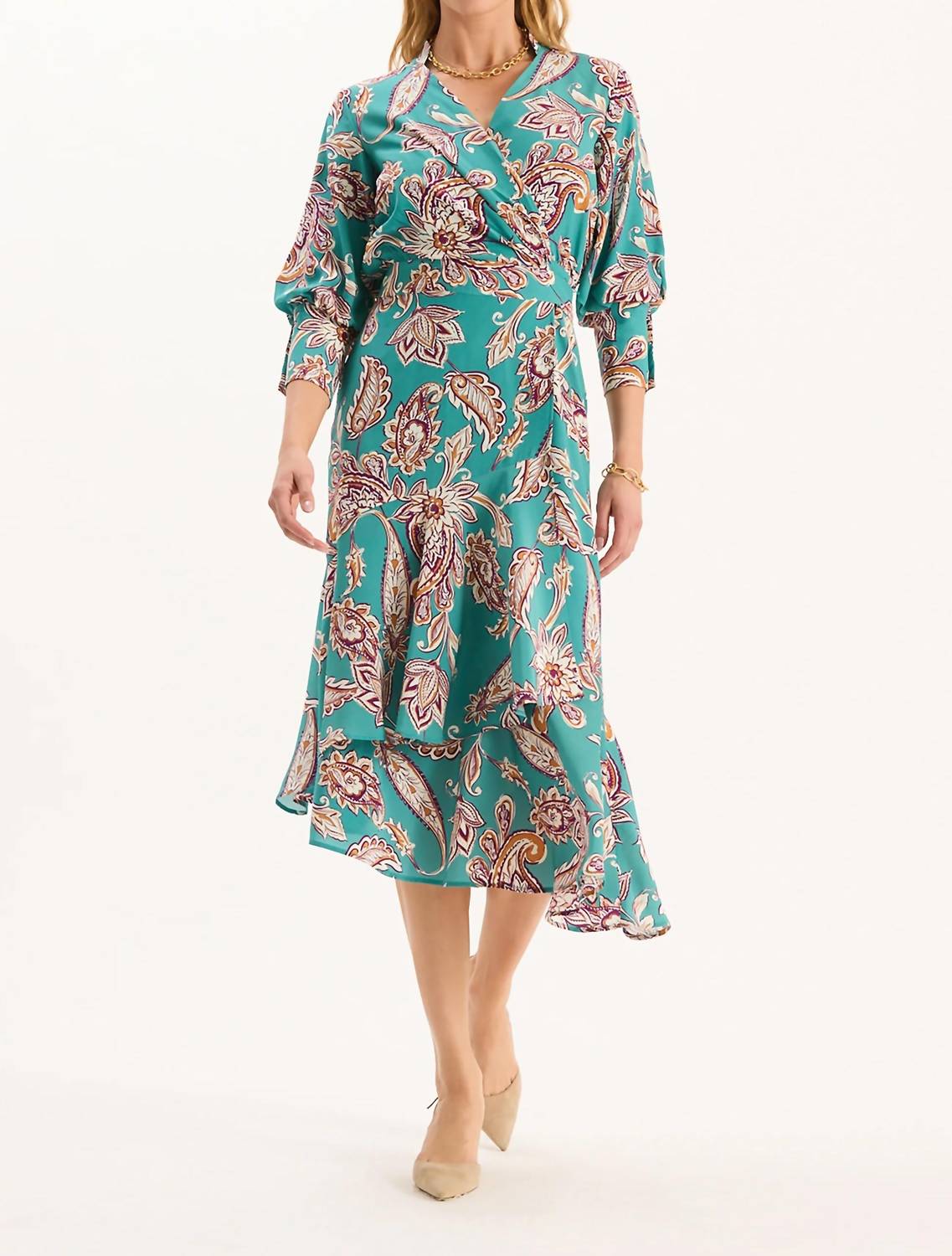 Pair with your favorite sandals for an effortlessly chic look. Introducing the Jules Midi Dress by Tyler Boe, a captivating piece that features three-quarter length sleeves with exquisite button cuffs. This dress is crafted from a blend of 70% Polyester, 25% Rayon, and 5% Spandex, offering comfort and style. The pull-on closure design includes a chic wrap front with a ruffled hem, perfect for a dinner party or Thanksgiving celebration. Care for this dress with a machine wash cold, and lay flat to dry or opt for dry cleaning to ensure it remains a beloved wardrobe staple for seasons to come.