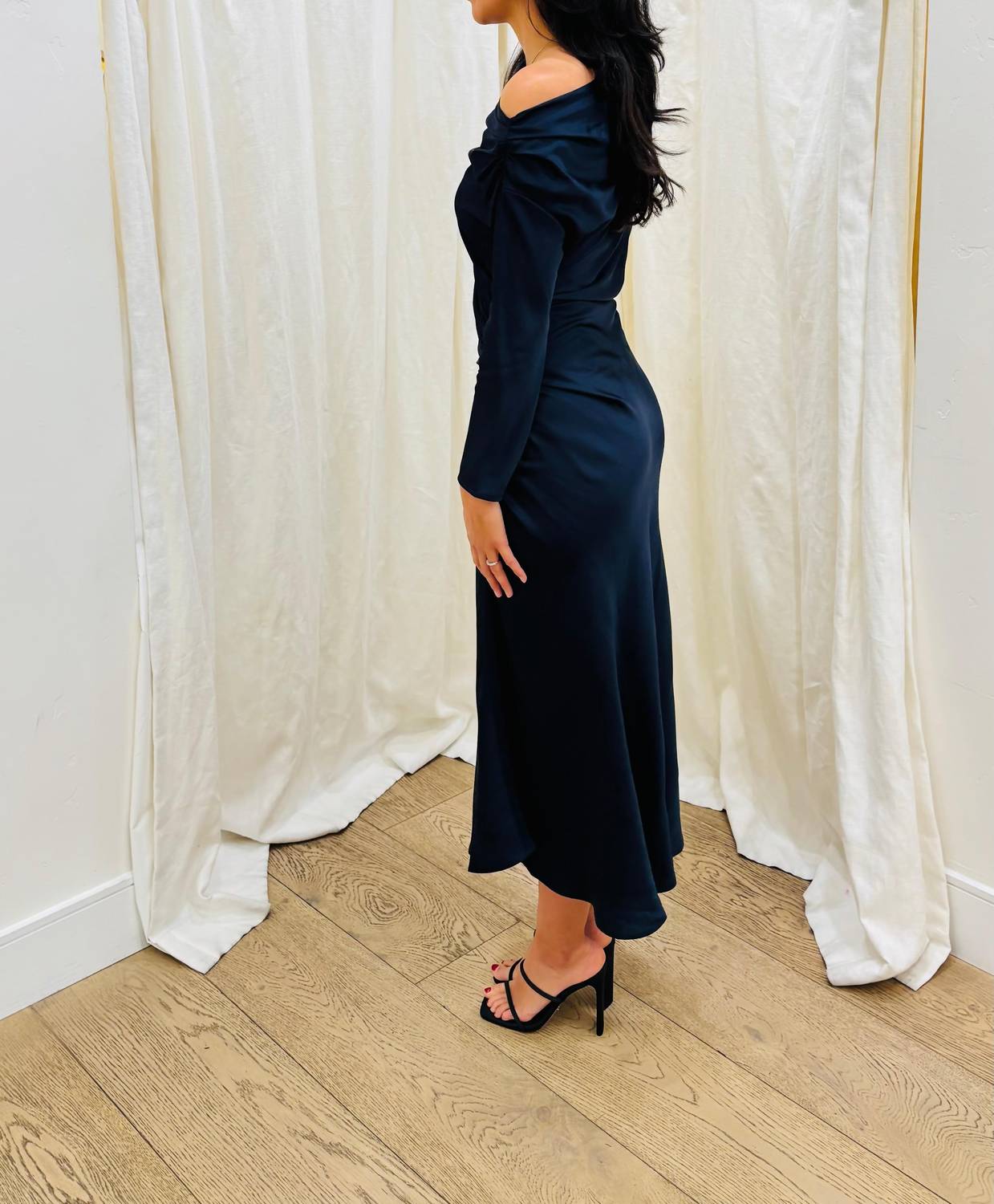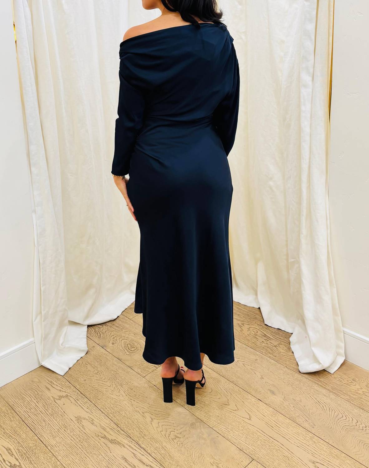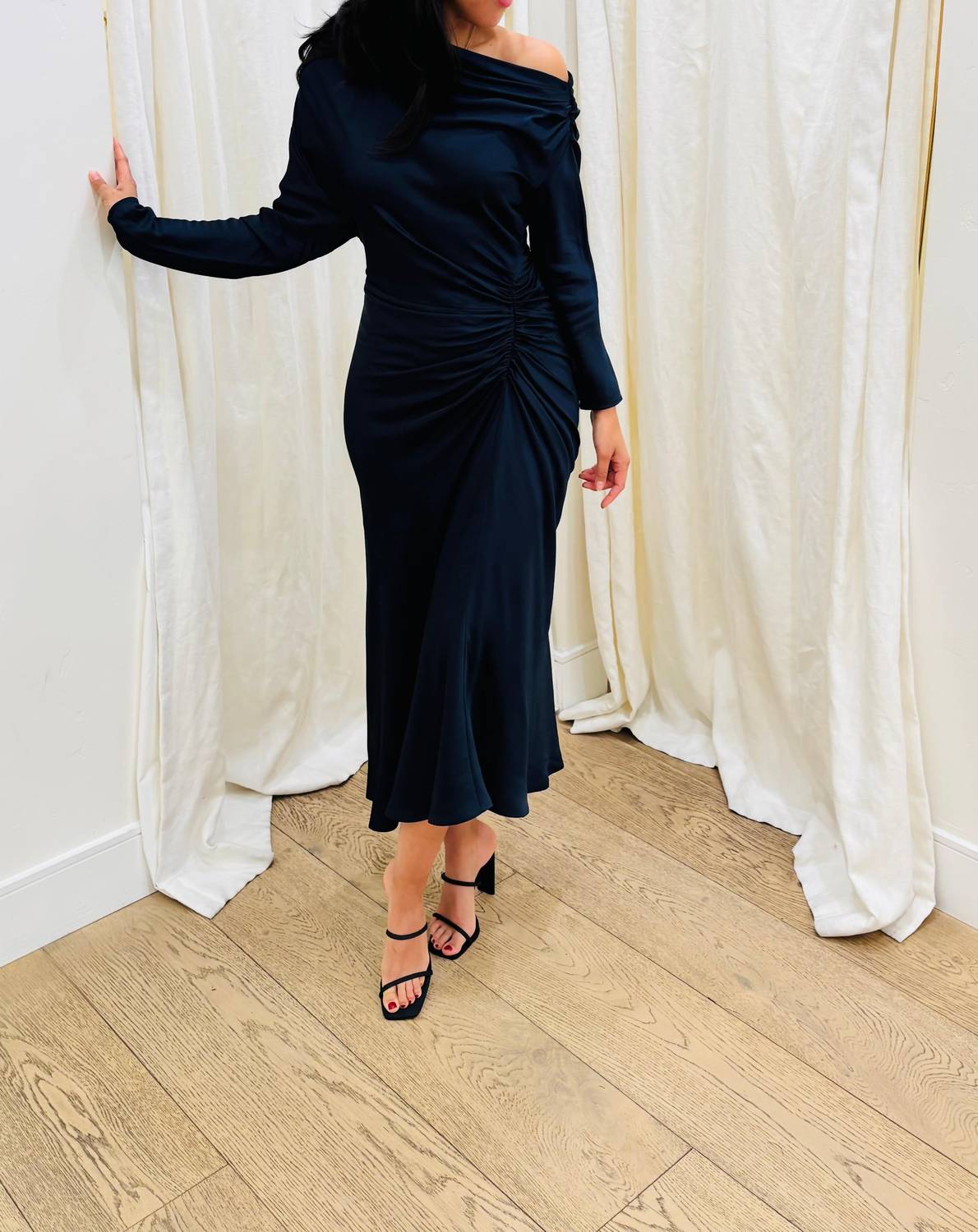The pefect long sleeve dress for those cooler months. Elevate your wardrobe with the Women's Piper Satin Dress by A.L.C., crafted in a luxurious satin composition in a dark sapphire shade. This minimalist sheath dress features a stylish off-the-shoulder neckline and long sleeves, perfect for a fall vacation occasion. With a pull-on closure, the design emphasizes elegance with its solid pattern and ruched waist. Model is wearing a size 4.