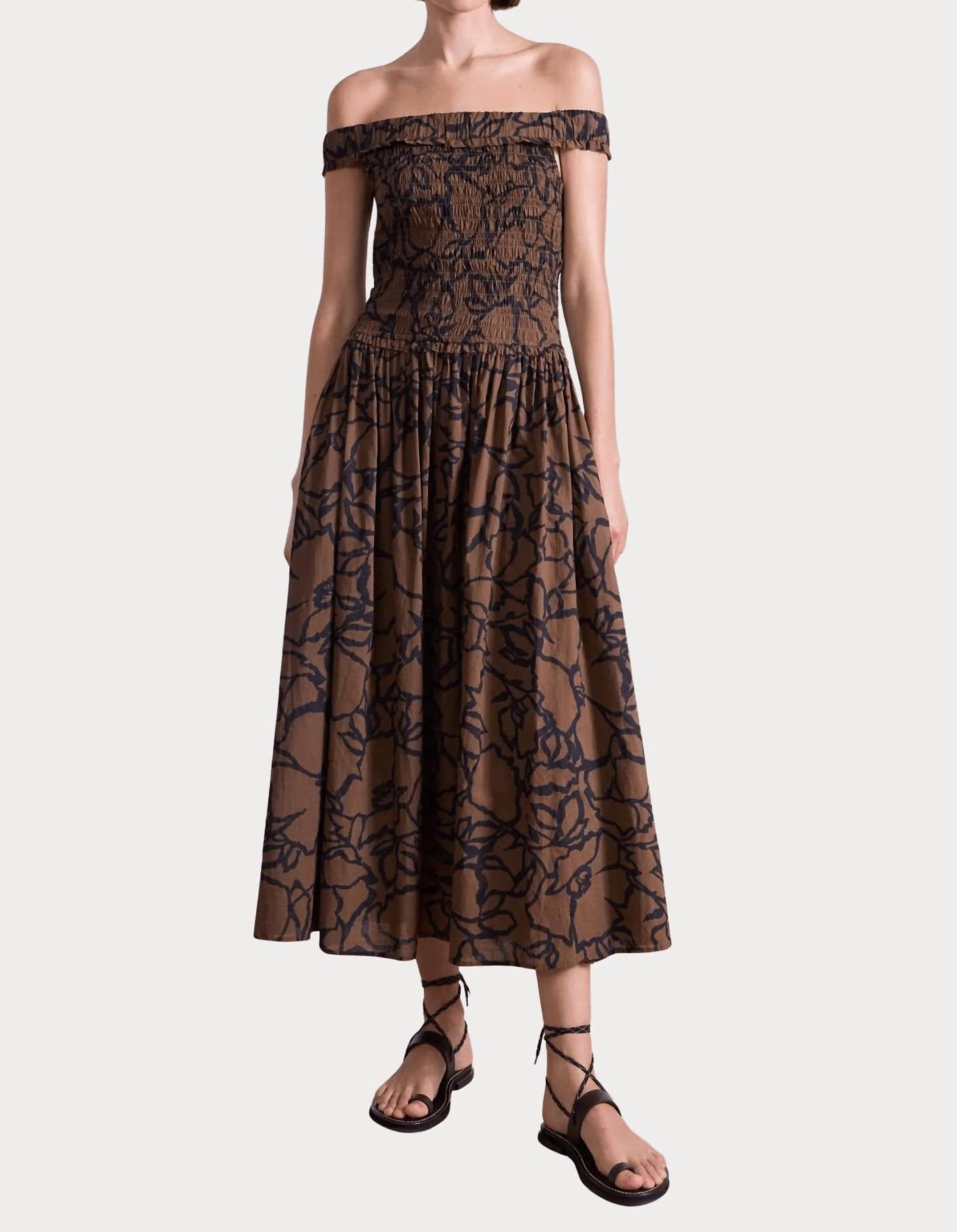 Cute and comfortable, this long sleeve dress has it all. Introducing the Britt Off-Shoulder Maxi Dress in Floral Chocolate by Apiece Apart, a perfect blend of boho chic and sophistication. This strapless dress features a fit and flare silhouette with elastic smocking throughout the bodice, offering a comfortable and flattering fit. Made in India from 100% organic cotton, it includes convenient side pockets for added functionality. Closure: Pull-on. Ideal for summer dinner parties and holiday celebrations. Model stands 5'10" and wears a size small.