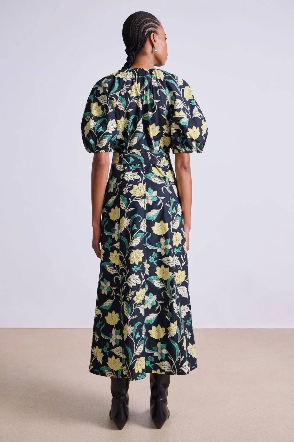 Who doesn't love a good maxi dress? This one you'll be reaching for season after season. Experience the essence of spring with the Neli Maxi Dress by APIECE APART, an ideal choice for your Easter vacation. This A-line silhouette dress showcases a crew neck and short lantern sleeves in a striking Essa Floral Citron pattern. Crafted from 100% regenerative cotton, it promises a sustainable touch and is made in India. Featuring a zip closure and a removable self-tie belt, it is best cared for by hand washing cold and laying flat to dry, or opting for dry cleaning.