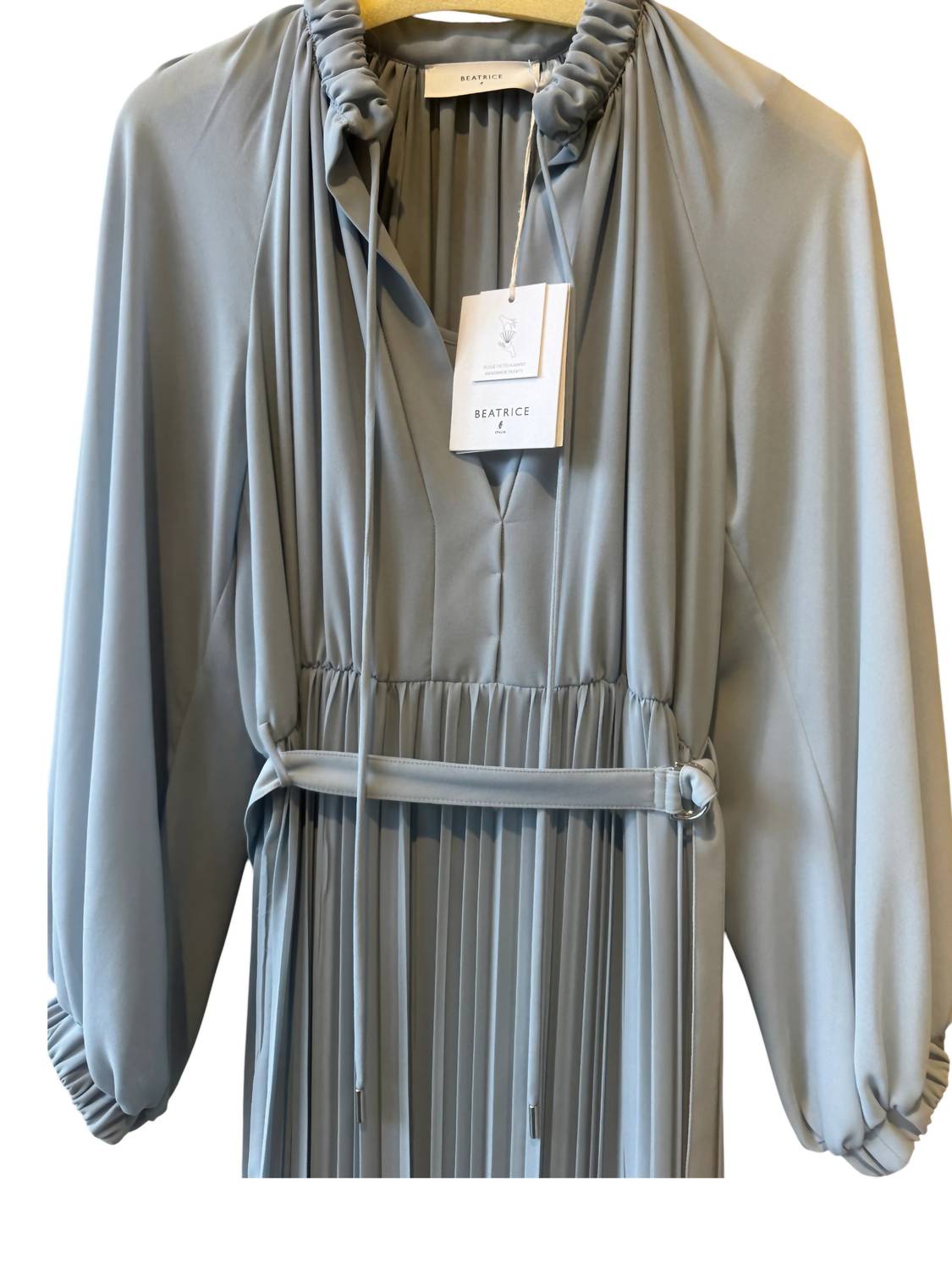 Introducing the Women's Long Georgette Dress by Beatrice .b, a masterpiece of quiet luxury in a mist hue, perfect for any evening event. Featuring elegant long raglan sleeves with pleats and a deep V-neckline accentuated by lace, this dress embodies sophistication. The textured A-line silhouette includes a marked waist, while the skirt's flat micro pleats offer a three-dimensional look. Crafted in Italy, it is styled with a tie closure, ensuring a flattering fit for spring festivities like Mother's Day.