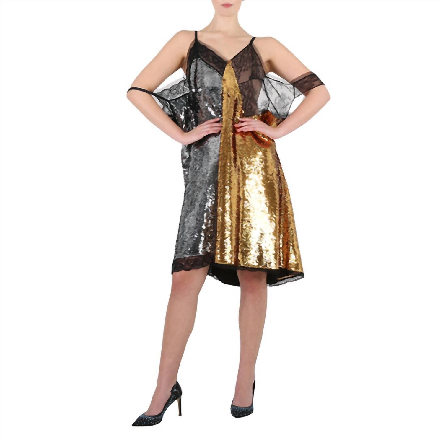 The perfect mini dress for those warmer months. This cocktail dress is covered in sequins and features a lace trim, V-neck, and thin straps. The bicolor design enhances the draped silhouette, creating a striking and elegant look, perfect for any special occasion.