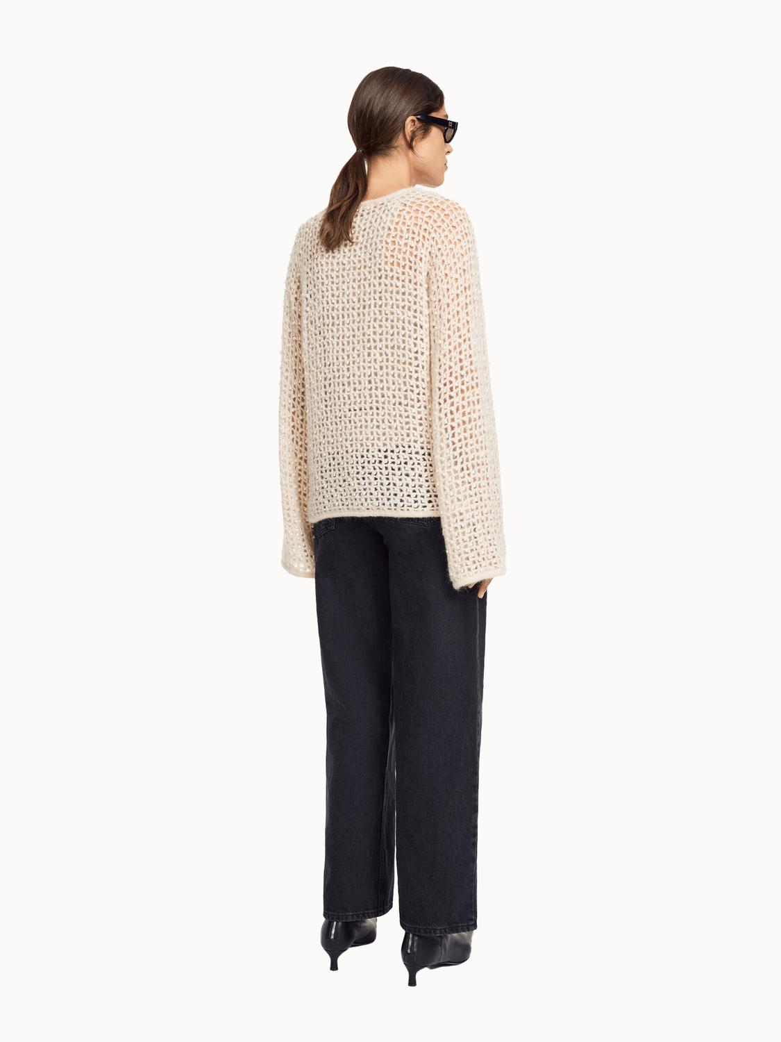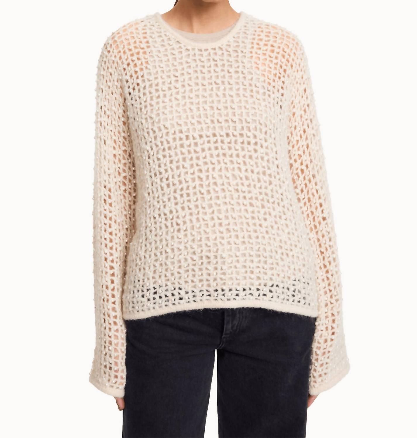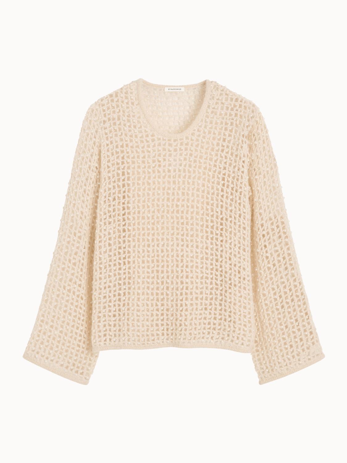 Introducing the Women's Amil Sweater by By Malene Birger, a boho chic piece in elegant Oyster Gray. This sweater features long wide sleeves and alluring cut-outs, enhanced with delicate pearl embellishments for a textured look. Crafted from a luxurious wool blend of 49% wool, 30% mohair, and 21% polyamide, it offers a loose fit that drapes beautifully. Closure: Pull on. Perfect for a fall vacation.