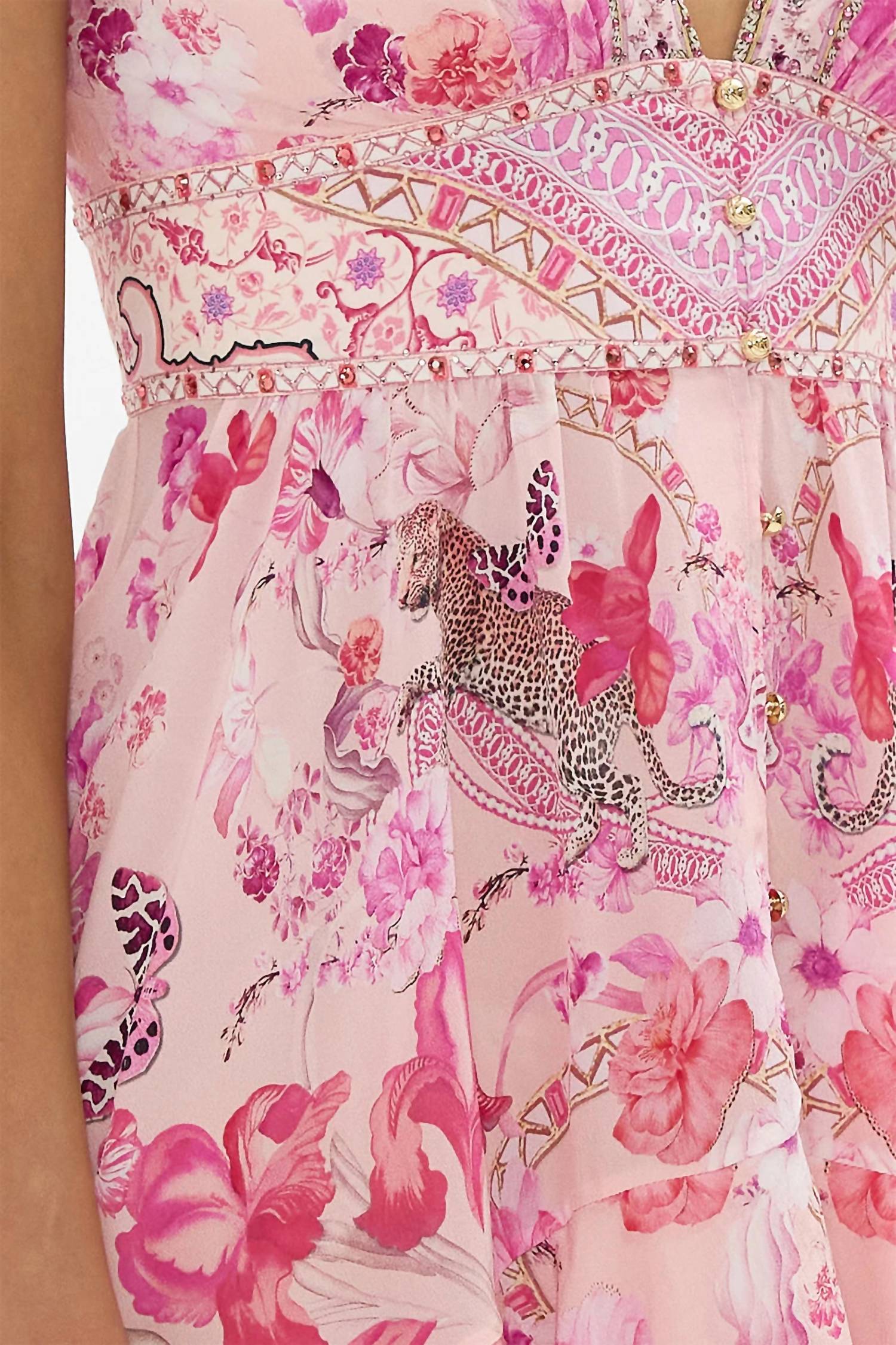 The perfect mini dress for those warmer months. Unveil the perfect ensemble for both leisure and celebrations with the Camilla Button Front Strappy Frill Dress in Botanical Novella. This 100% silk mini dress features delicate spaghetti straps and a flattering sweetheart neckline. The button front closure, paired with a fitted waistband and elasticated back bodice, ensures a comfortable fit, while crystal embellishments add a touch of glamour. Care for this elegant piece by opting for dry cleaning to maintain its luxurious composition.