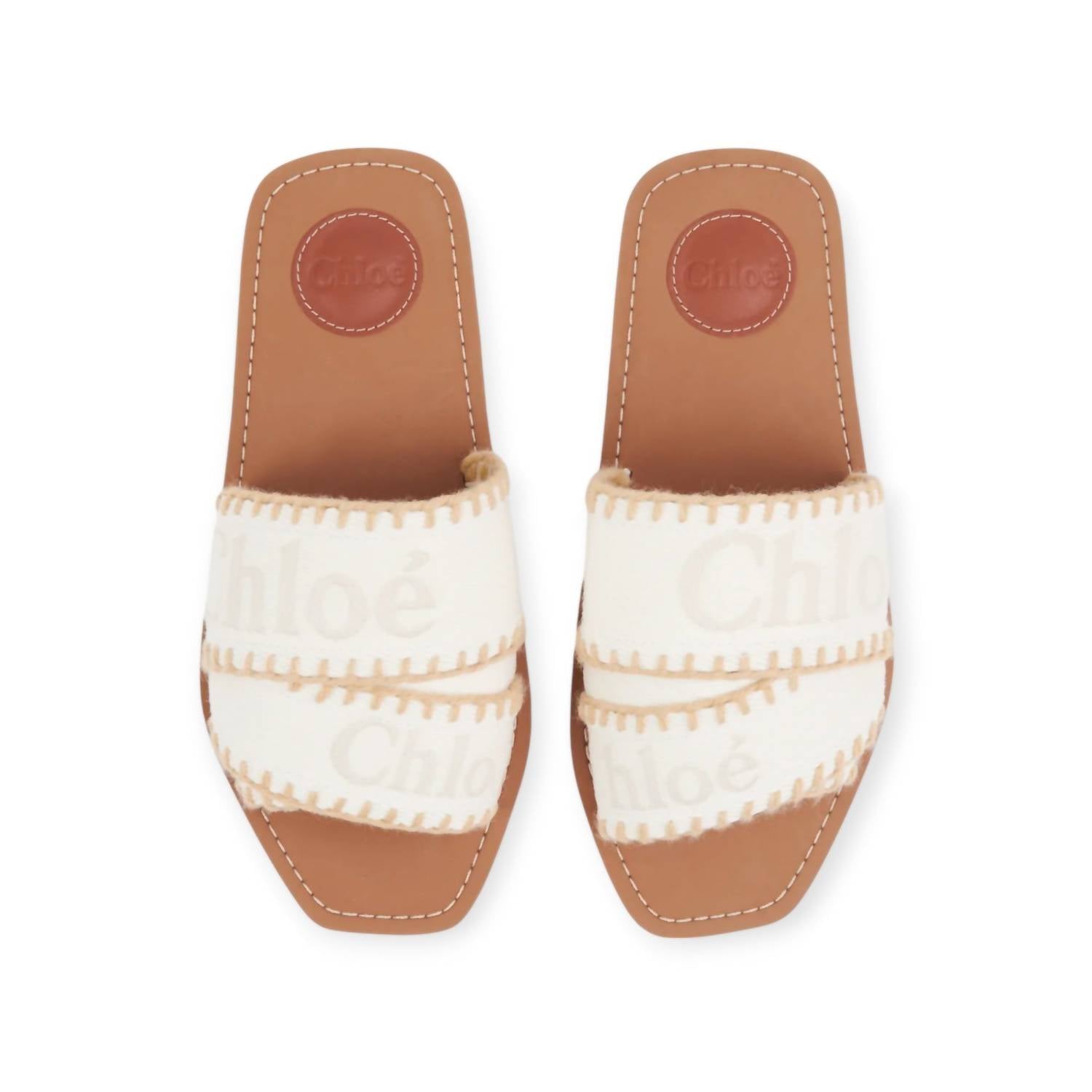 Flowy dresses, cropped pants, and even jumpsuits... this sandal works with them all! Reimagined with a lower-impact linen construction, the Chloe Women's Woody Flat Mule in Vanilla Ice promises both style and sustainability. Featuring an interplay of different-sized ribbons with the iconic embroidered Chloe logo, these slip-on mules offer a comfortable fit and signature detailing, including the Maison's "O" on the inner sole. Made of 90% linen and 10% polyester, the flat mule design boasts a recycled EVA sole for added comfort. Ideal for summer, these mules fit true to size with a European sizing, merging fashion with an eco-friendly conscious choice.