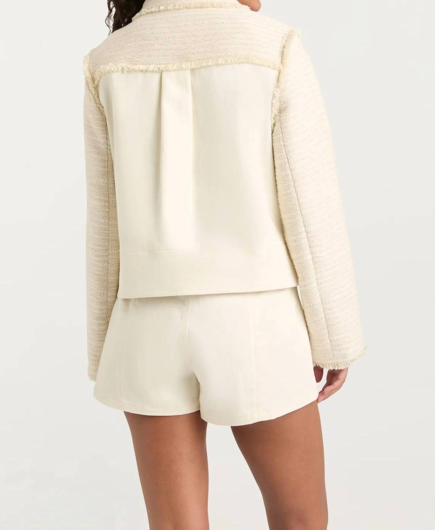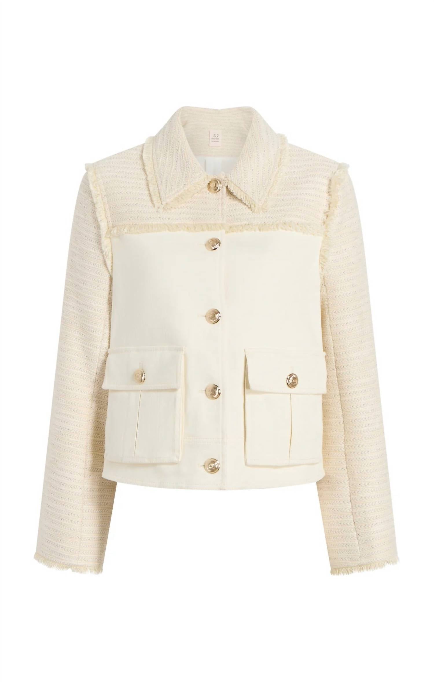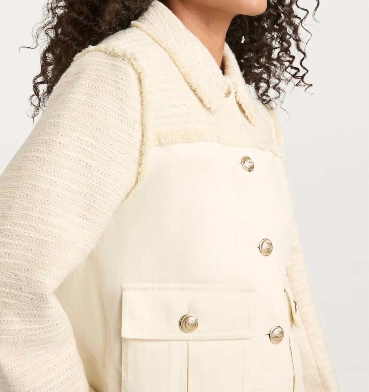 A jacket so versatile you can literally wear it with anything. Elevate your wardrobe with the Braided Tweed Liliana Jacket by Cinq à Sept, an elegant choice for your collection. This ladies' jacket features long sleeves and is crafted from a luxurious 70% cotton, 30% polyester blend, promising a soft yet textured feel. With its button closure and a chic length of 22.75 inches, it is the epitome of quiet luxury. Made for dry cleaning, this statement piece is perfect for vacation and spring occasions.