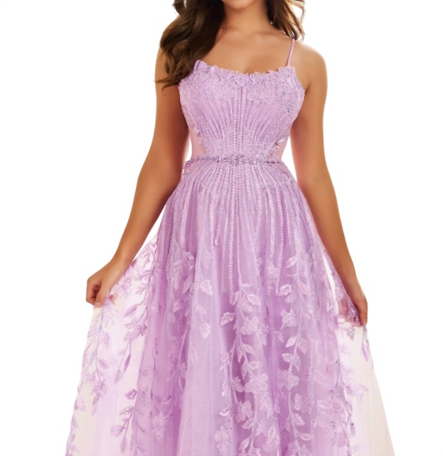 Turn heads in the cutest and most flattering evening dress. Unveiling the Ellie Wilde Corset Glitter Tulle Prom Dress in a captivating lilac shade, perfect for making a dazzling entrance. This sleeveless dress features a sophisticated corset bodice with spaghetti straps and a graceful A-line silhouette crafted from luxurious beading, glitter tulle, lace appliques, organza, and stone accents. Designed with practicality in mind, it features discreet pockets, while the natural waistline flatters every figure. Closure: Zip closure. Ideal for prom, this dress embraces the Quiet Luxury trend, ensuring you shine with elegance.