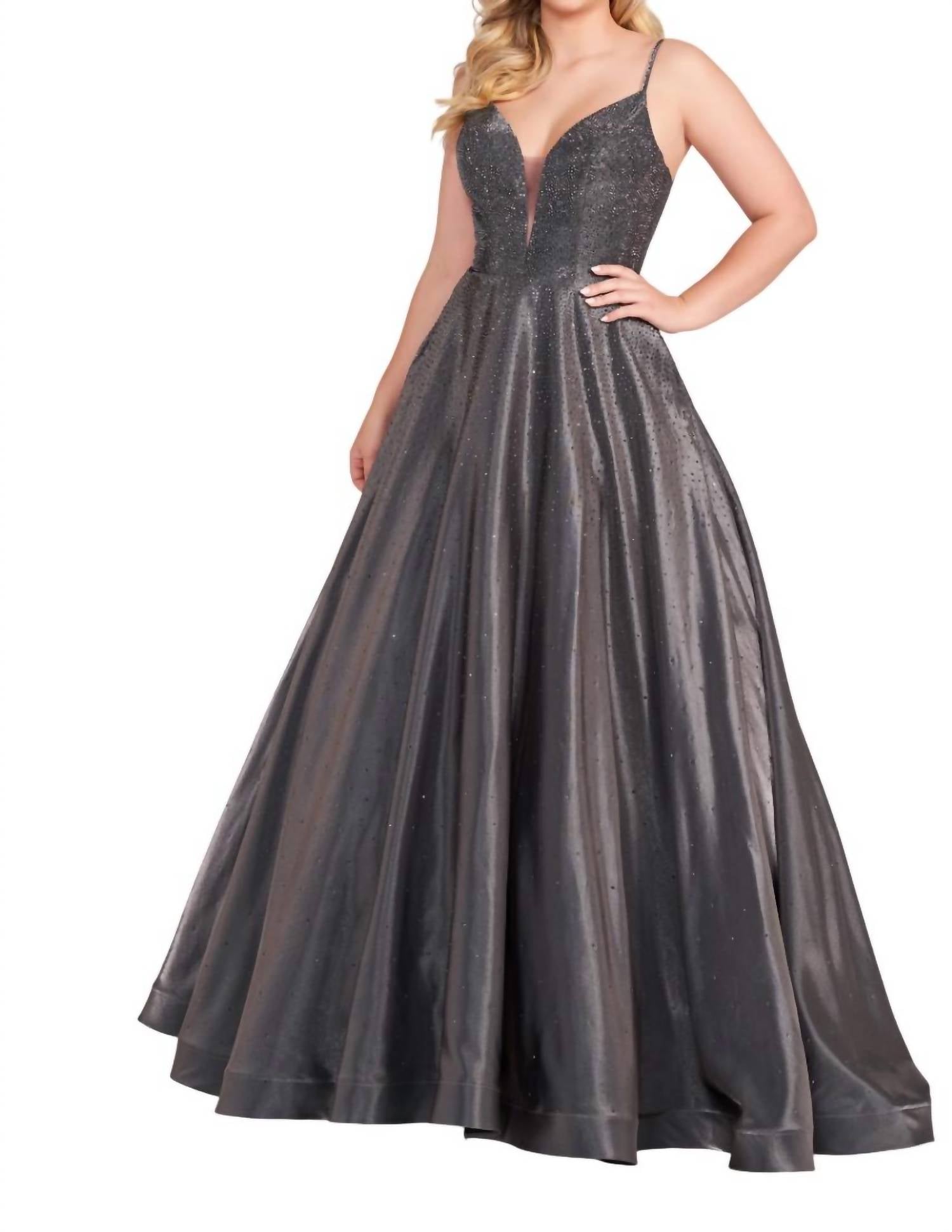 Seja o centro das atenções com este requintado vestido de baile em corte A, confeccionado em jersey suntuoso e tecido metálico brilhante para um toque de elegância radiante. Com um gracioso decote em V e alças delicadas, o modelo emoldura o decote, enquanto as costas com amarração em corpete garantem um ajuste perfeito. A saia fluida se estende em uma cauda dramática, criando uma silhueta cativante, ideal para qualquer ocasião inesquecível. Abrace o glamour refinado e a confiança neste deslumbrante vestido formal.