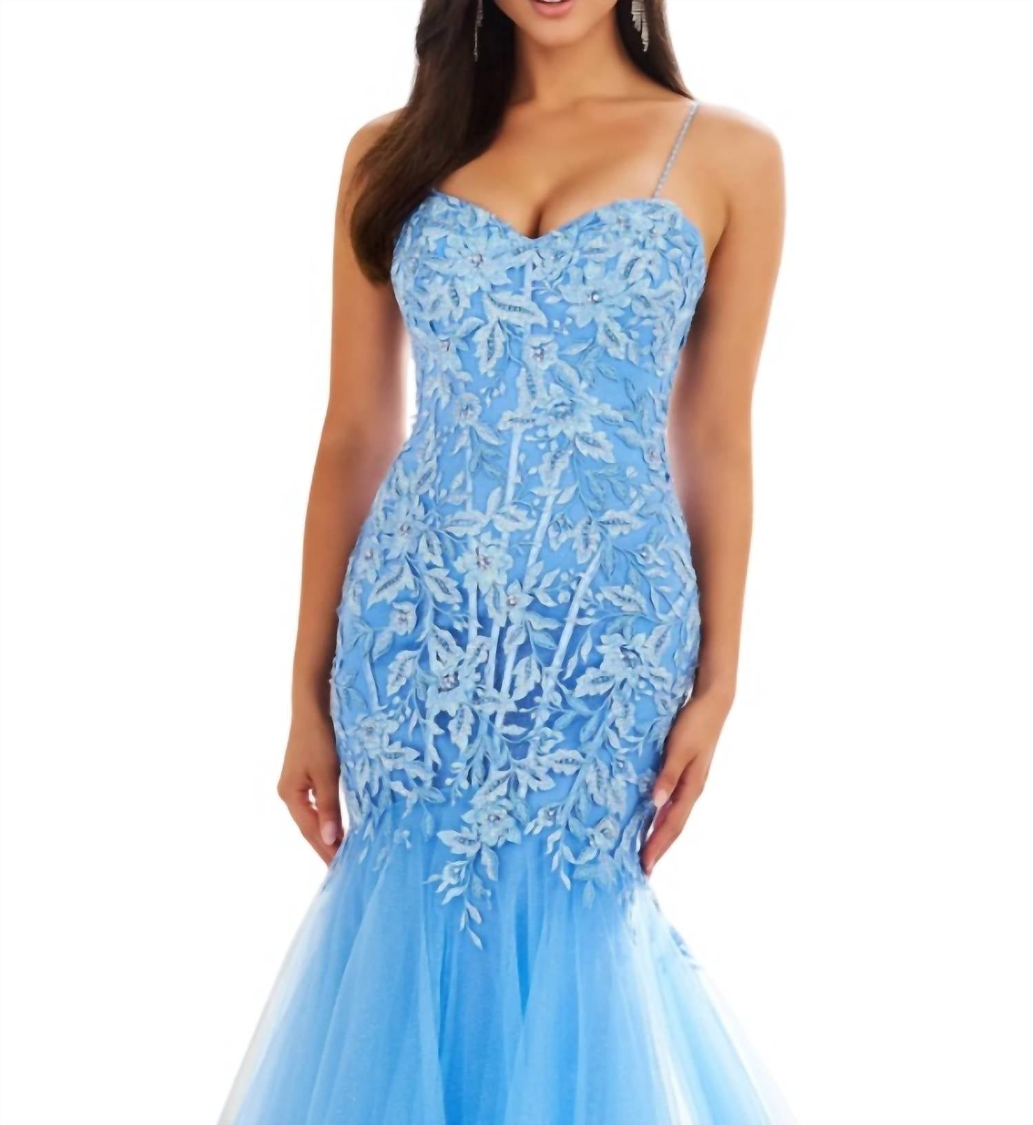 Looking for that perfect event dress? Look no further... Step into elegance with the Lace Applique Mermaid Prom Dress by Ellie Wilde in a captivating bluebell hue. This exquisite gown is sleeveless with spaghetti straps and boasts a sweetheart neckline for an alluring appearance. Made from glitter tulle, it features lace applique and stone accents, elegantly crafted in a long mermaid silhouette with a corset bodice and lace-up back. Perfect for prom, this dress epitomizes quiet luxury with its natural waistline and detailed design.