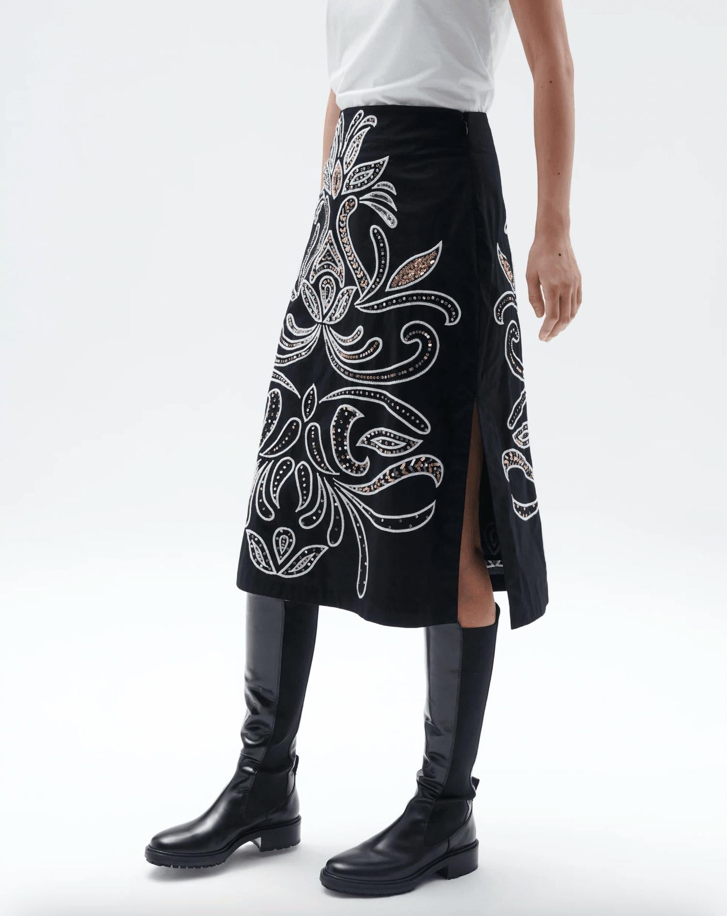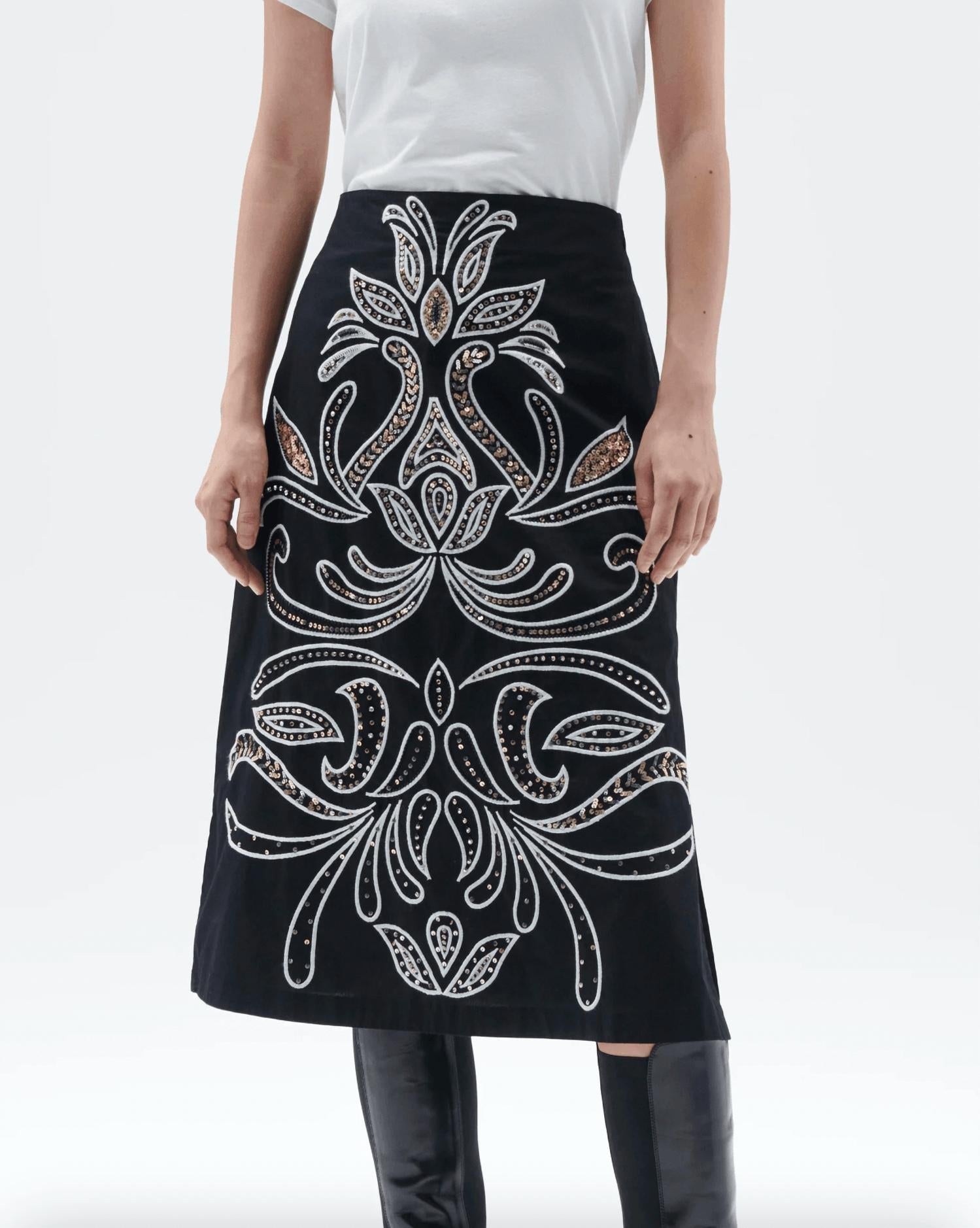 Show off just the right amount of skin in this beautifuly designed midi length skirt. Introducing the Sloane Cotton Skirt by FIGUE, a piece that combines elegance with a touch of sparkle in a sleek black hue. This patterned skirt, crafted from pure Cotton Poplin, features a flattering high-waist and side slits that enhance its slightly A-line shape. Adorned with intricate embroidery and sequin motifs, it offers a dose of maximalist flair ideal for summer vacations or festive occasions like Easter. Closure: Side zip closure. Care: Dry clean only. Length: 29 inches from highest point to hem.