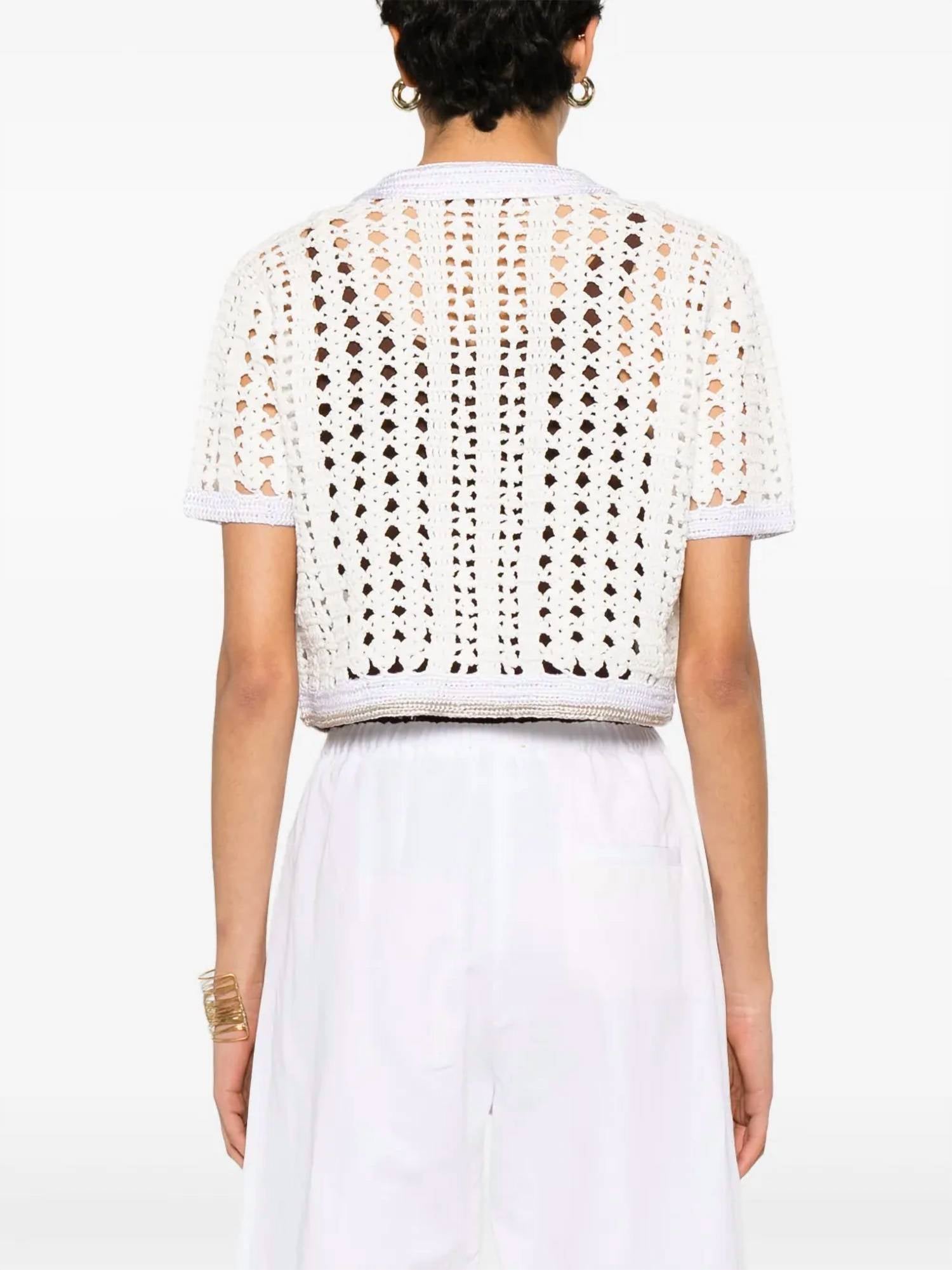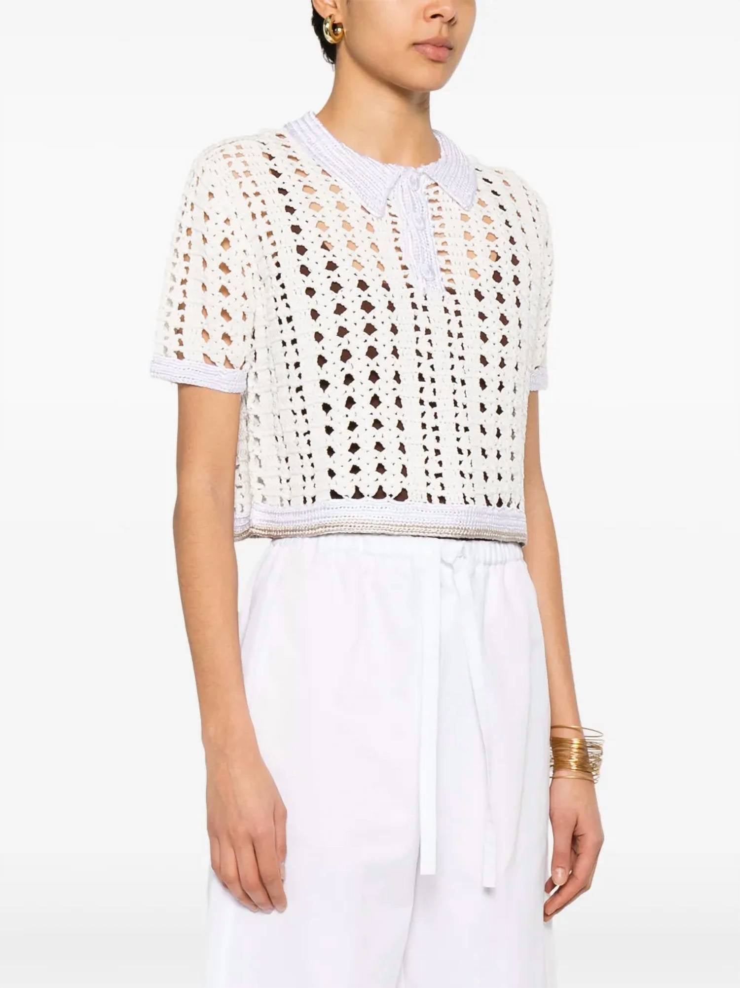 Pair this crop top with your favorite high-waisted jeans or maxi skirt. Embrace the spirit of spring fashion with Forte Forte's Cable Lux Crochet Cropped Polo in a stunning Giglio hue. This women's crop top features short sleeves and a sophisticated collar, crafted from a blend of 73% cotton and 27% viscose for a textured and luxurious feel. The button closure adds a classic touch, making it ideal for your next vacation or Thanksgiving gathering. Care for this Y2K-inspired piece by opting for dry clean only.