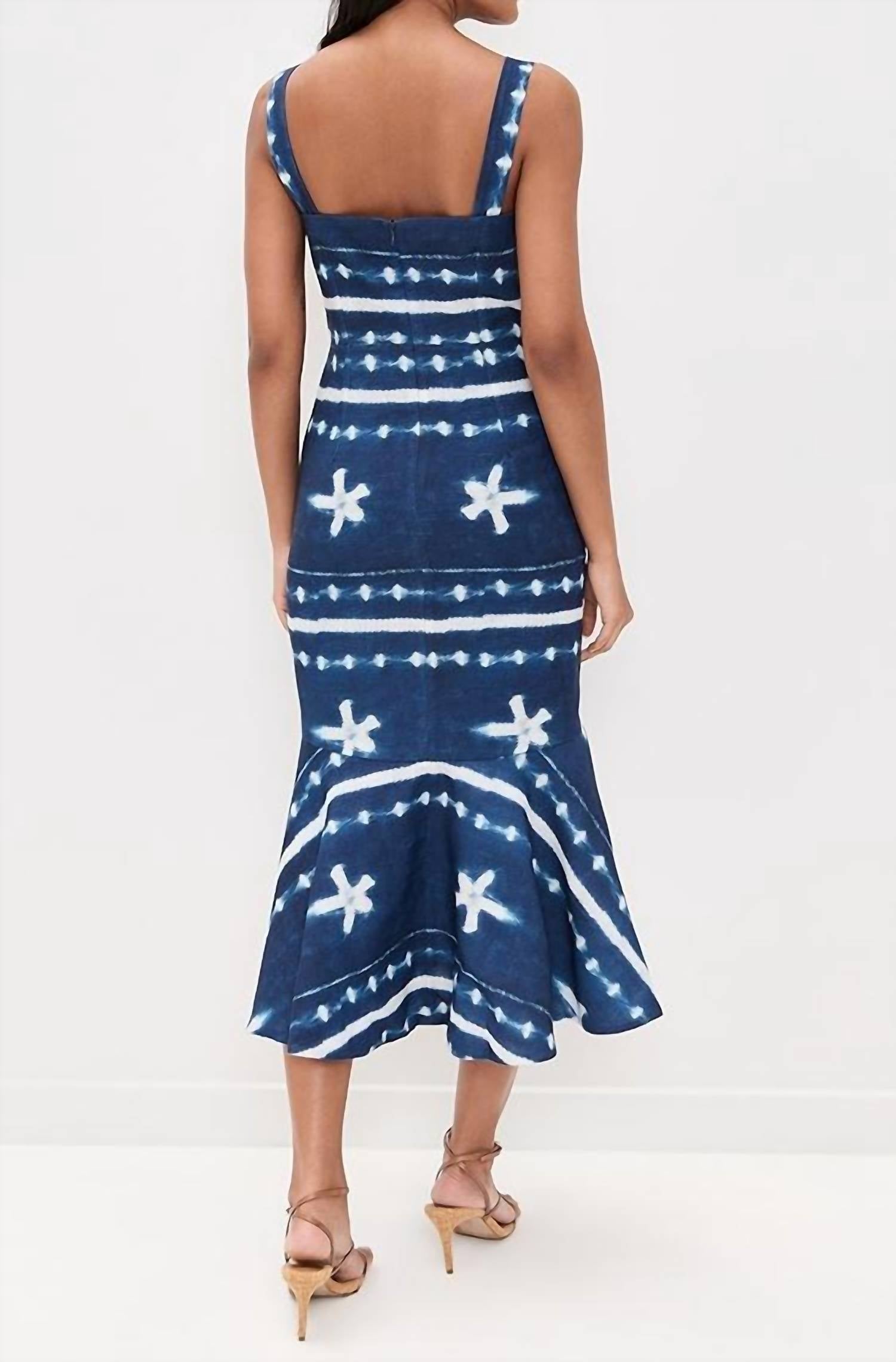 Introducing the Natasha Dress by JBQ, a sophisticated choice for your summer wardrobe in striking Indigo Shibori. This sleeveless midi dress features a unique tie-dye stripe pattern and a fashionable square neckline. Crafted from mid-weight, non-stretch polyester, it includes adjustable shoulder straps and a length of 48 inches from the shoulder, ensuring a perfect fit. Imported, it offers a seamless finish with a hook-and-eye and hidden zip closure at the back. Care instructions recommend washing cold to maintain its vibrant look.