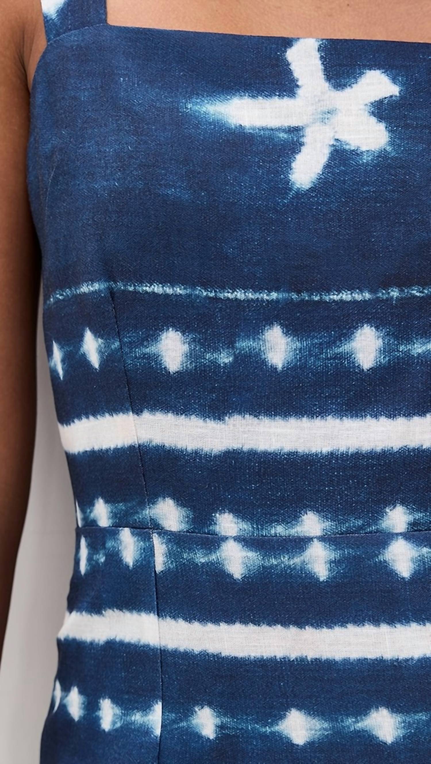 Just add slides or mules and you are good to go. Introducing the Natasha Dress by JBQ, a sophisticated choice for your summer wardrobe in striking Indigo Shibori. This sleeveless midi dress features a unique tie-dye stripe pattern and a fashionable square neckline. Crafted from mid-weight, non-stretch polyester, it includes adjustable shoulder straps and a length of 48 inches from the shoulder, ensuring a perfect fit. Imported, it offers a seamless finish with a hook-and-eye and hidden zip closure at the back. Care instructions recommend washing cold to maintain its vibrant look.