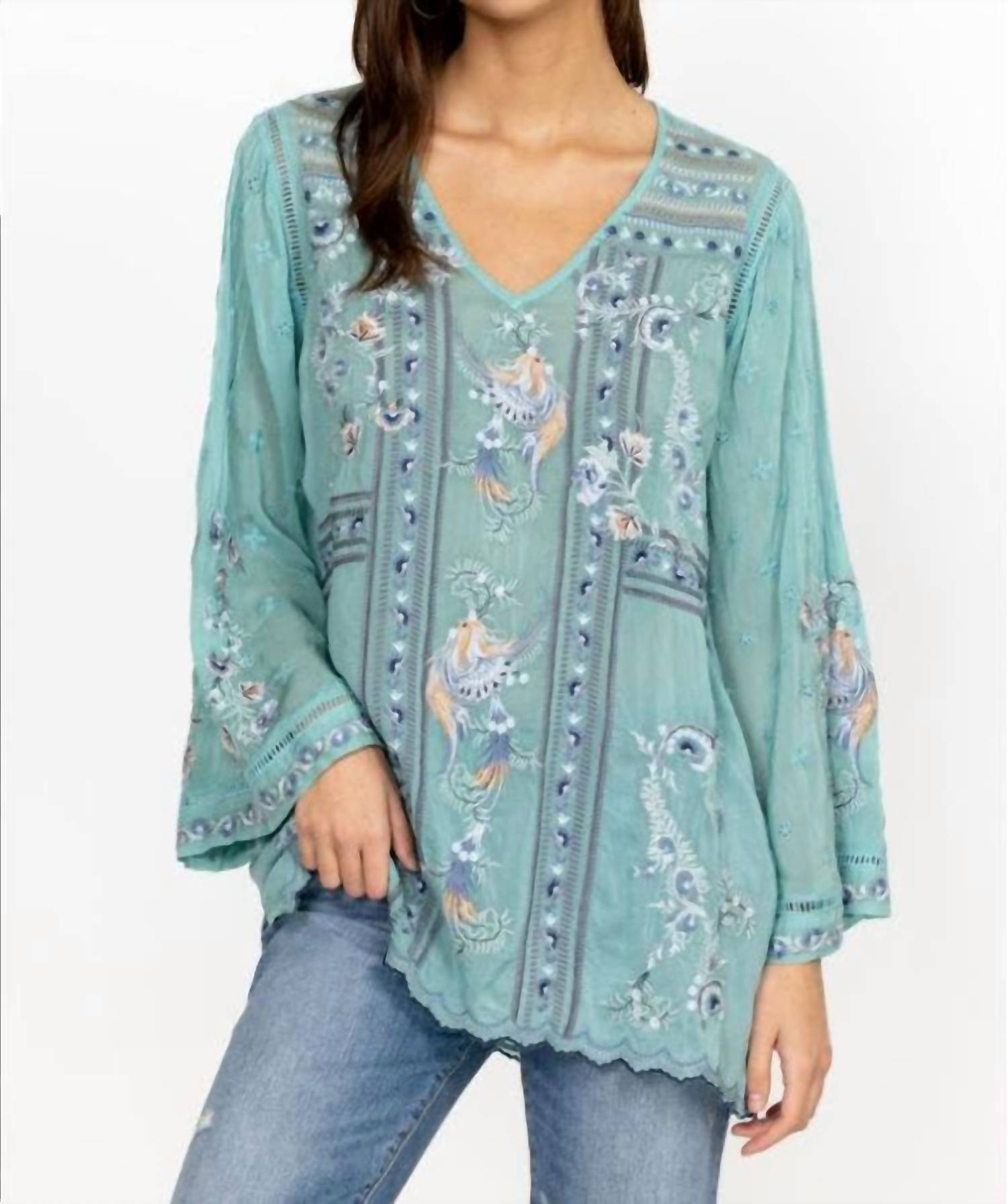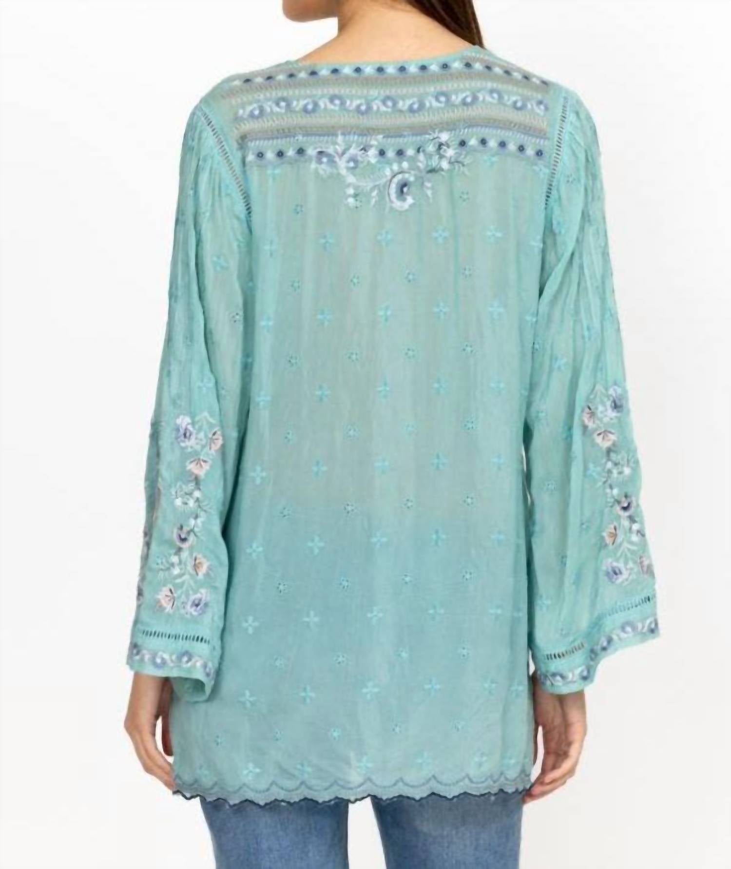 Um complemento perfeito para qualquer guarda-roupa, esta blusa clássica estilo túnica é elegante e prática. Você pode facilmente transitar da mesa para o jantar com esta blusa chique. Confeccionada em tecido leve, apresenta decote em V, mangas longas e largas, bordado floral intrincado e bainha recortada. 100% rayon. Bordado de posicionamento. Bainha recortada. Manga franzida. Altura da modelo: 1,80 m. A modelo está vestindo tamanho P. Medidas para o tamanho M: Comprimento - 78 cm, Busto - 110 cm. Instruções de cuidado: Lavar à máquina somente com água fria. Usar alvejante sem cloro quando necessário. Secar em temperatura baixa. Passar a ferro em temperatura morna. SKU C25823-2:MARINEBLUE.