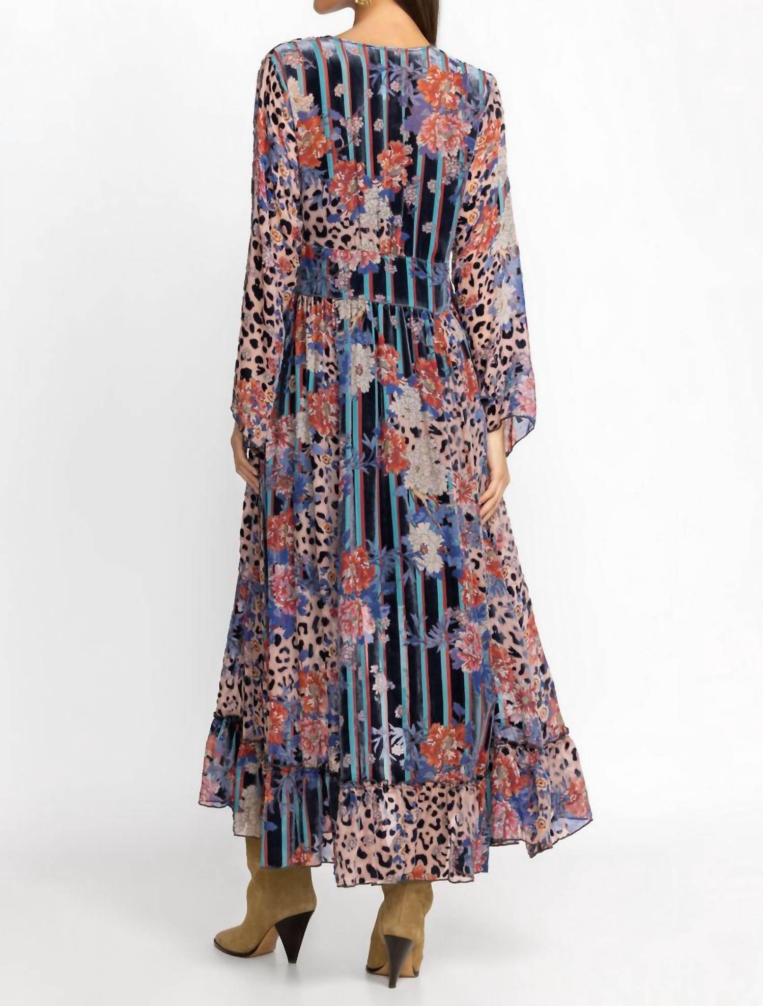 Descubra o Vestido Longo Ontar Beesley da Johnny Was, uma peça cativante com uma estampa floral vibrante, perfeita para qualquer ocasião. Este vestido feminino é confeccionado em 82% rayon e 18% seda e apresenta um corte justo com mangas compridas e um elegante decote em V. O vestido inclui fecho de botão para um ajuste seguro. Cuidados: Lavagem a seco e secagem no varal.