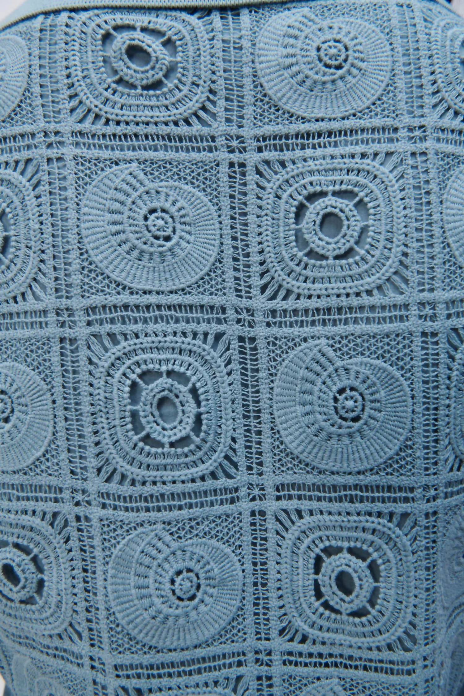 O minivestido perfeito para os meses mais quentes. O Vestido-Camisa Gabrielle Crochet Coverup, de Jonathan Simkhai, é uma peça única confeccionada em Azul Celeste para um look primaveril descontraído. Com mangas curtas e silhueta minivestido polo, este vestido apresenta um padrão nostálgico de conchas fósseis em crochê estilo "granny square" personalizado. Possui gola ampla e um decote em V elegante para um jantar chique ou um look de trabalho. Este vestido oferece um fecho de pressão confortável para facilitar o uso.